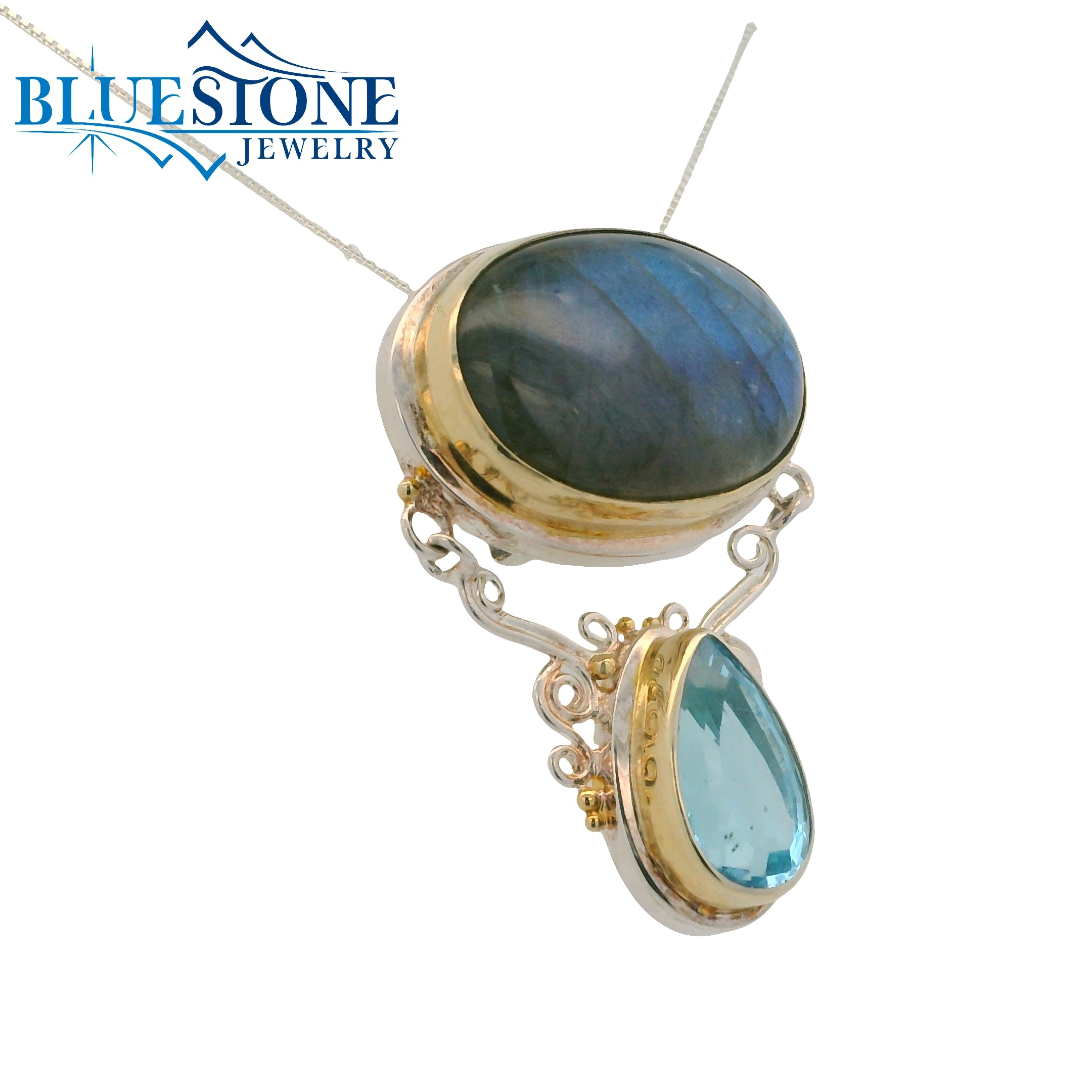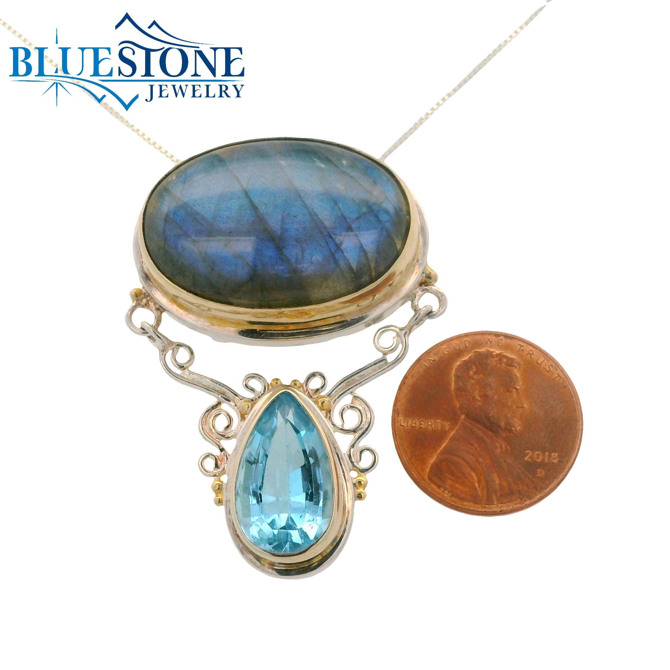 Sterling Silver and 22 Karat Yellow Gold Vermeil Pendant with One 1" x 3/4" Oval Cut Natural Labradorite and One 9mm x 5mm Pear Cut Baby Blue Topaz. Pendant Measures 1.25" x 1.75". Comes on an 18" Sterling Silver Box Chain. Local Lake Tahoe Artist Michou.