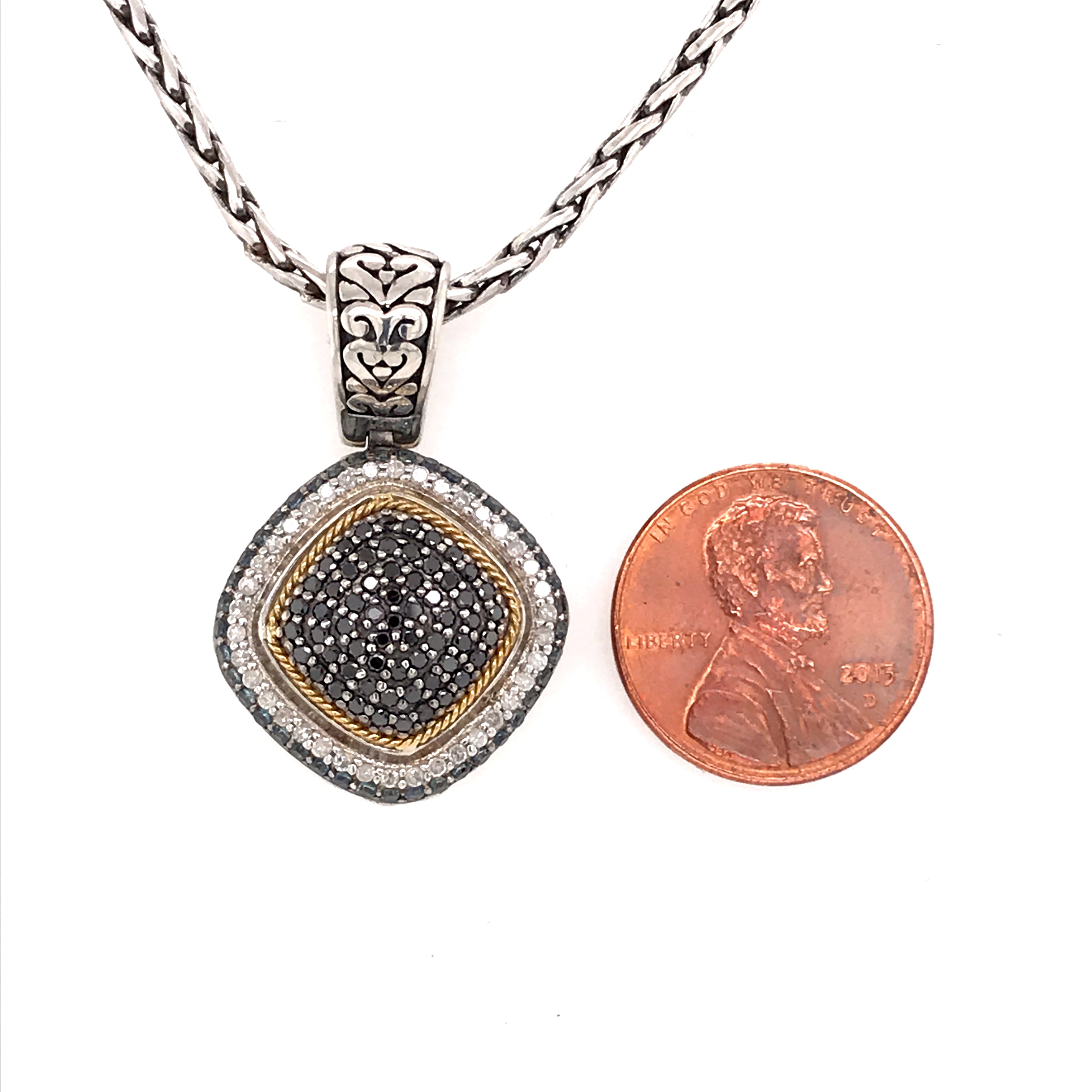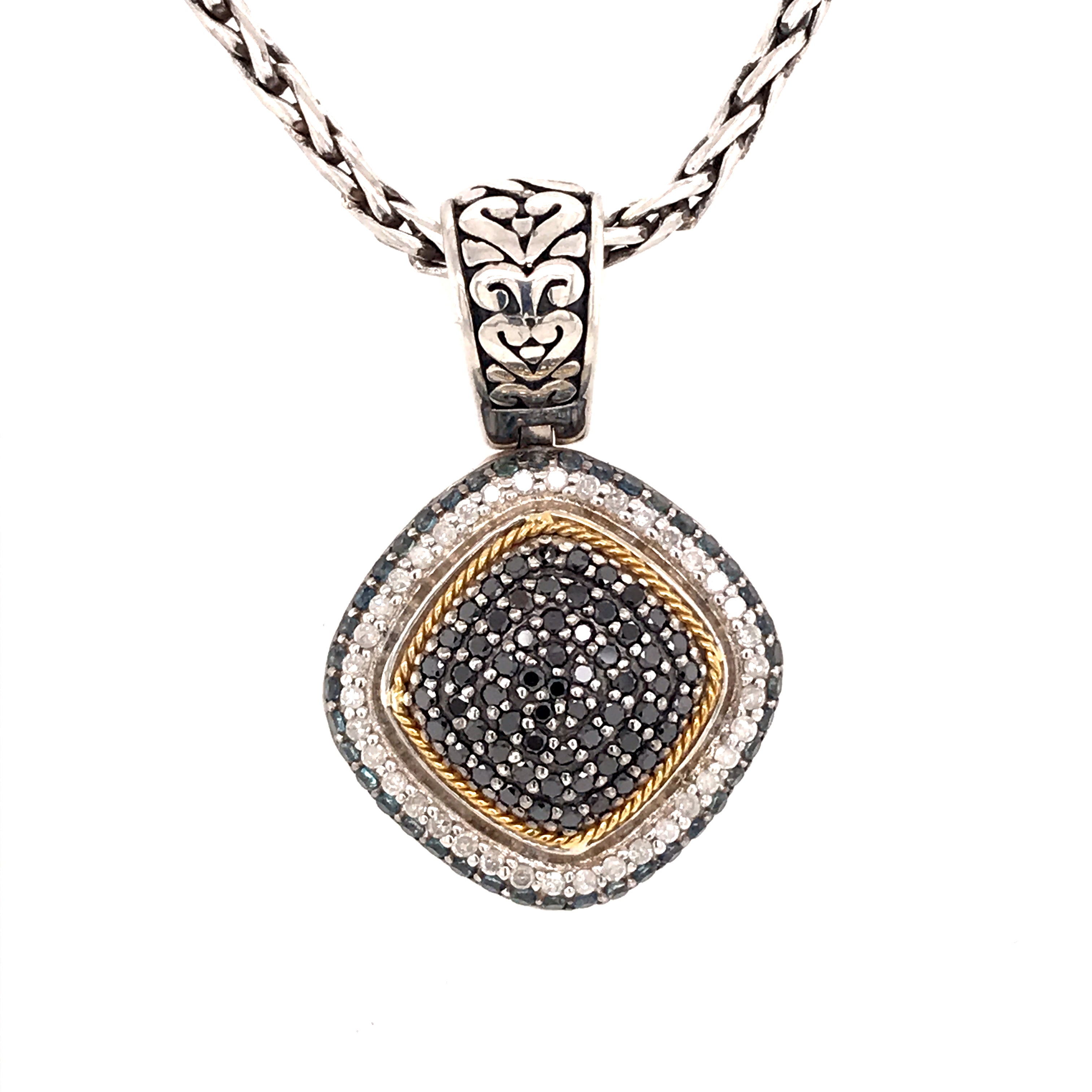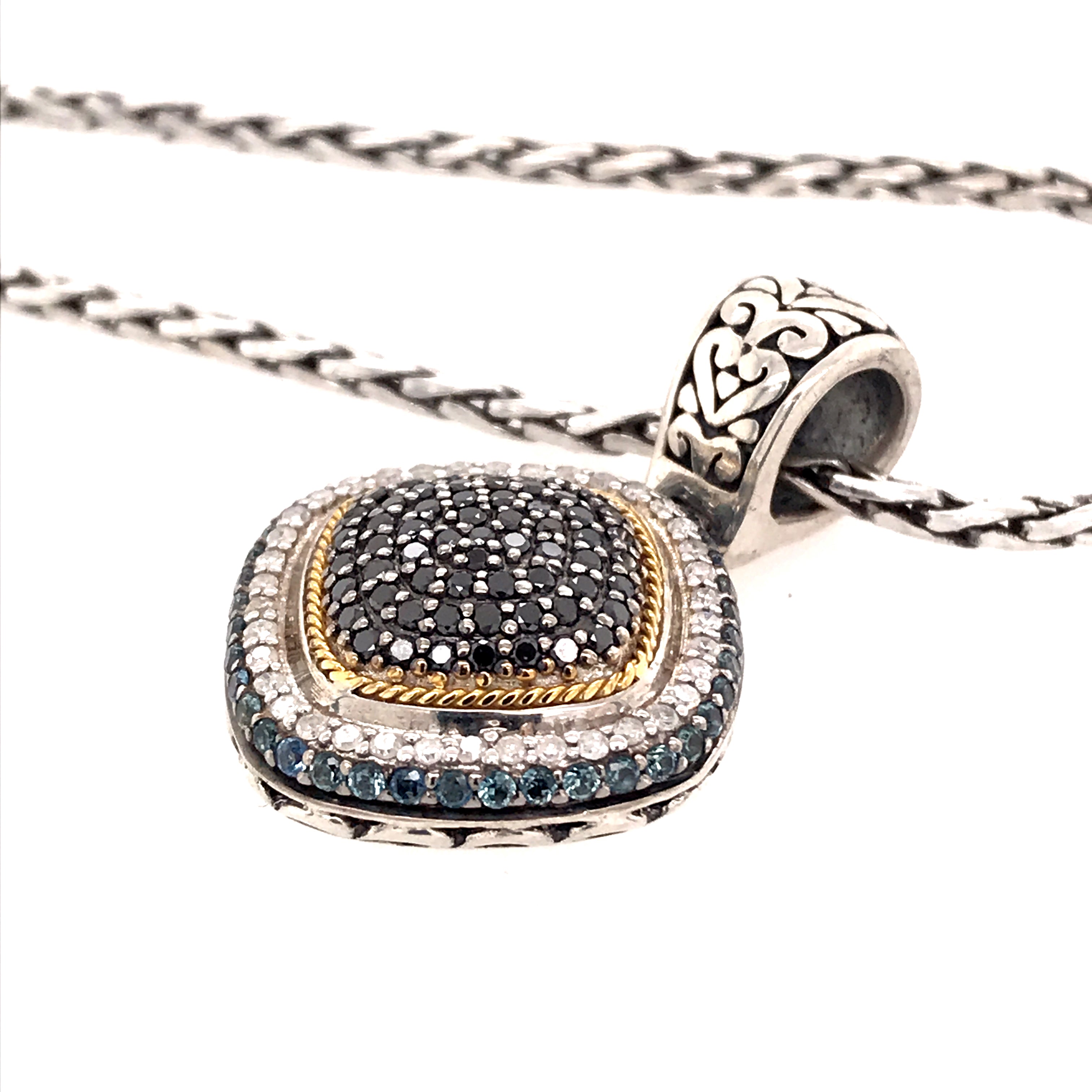 Sterling Silver and 18 Karat Yellow Gold Vermeil Accent Necklace with Round Blue Sapphires and Round Black and White Diamonds, Pendant measures approximately 7/8 of an inch by 1.25 inches. Comes on a handwooven Sterling Silver chain, 20 Inches in Length. Lake Tahoe Designer