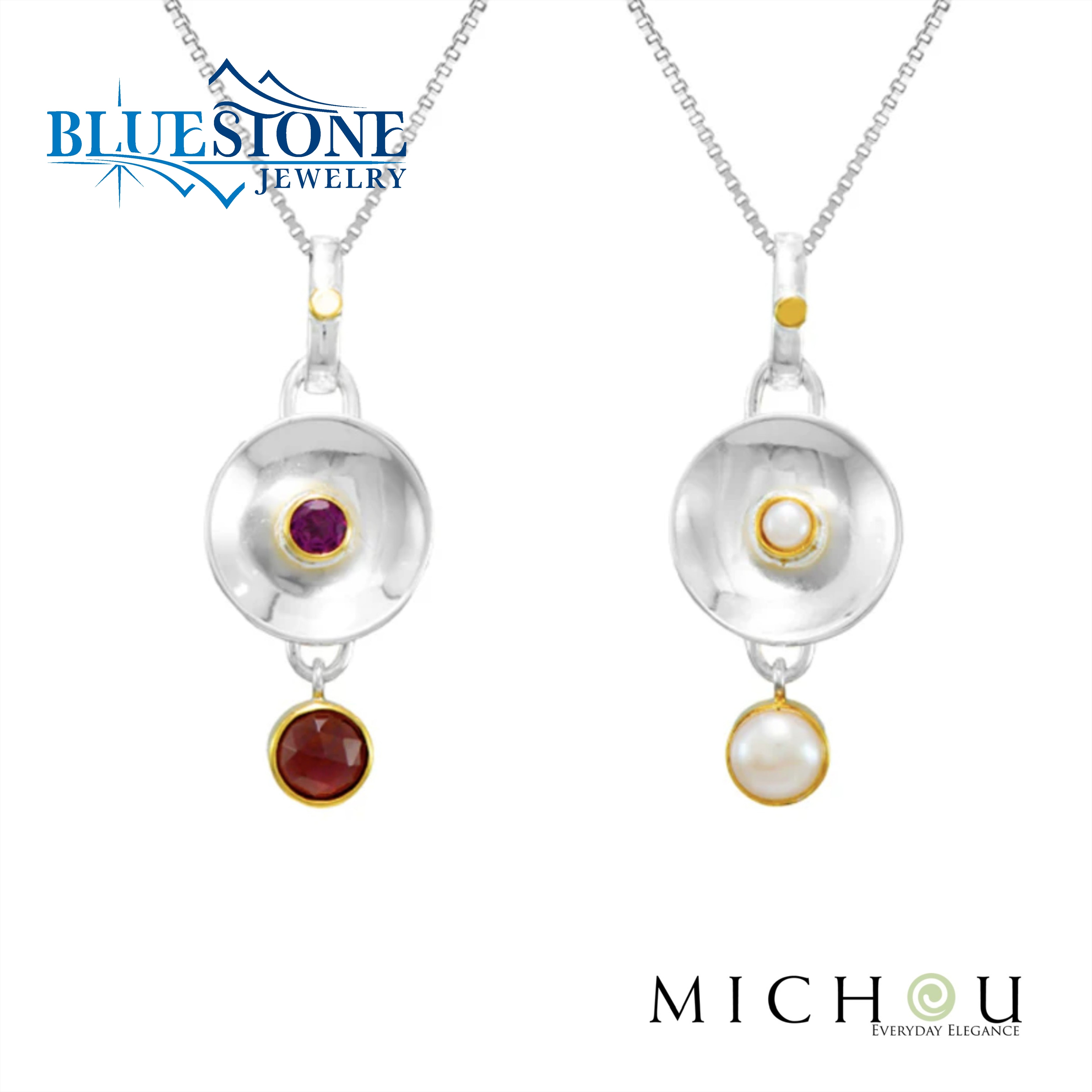 Sterling Silver and 22 Karat Gold Vermeil Reversible Pendant with 1 Round Garnet, 2 Round White Freshwater Pearls and 1 Round Rhodolite Garnet. Pendant Measures 1/2" x 1". Comes on an 18 Inch Sterling Silver Box Chain.Local Lake Tahoe Artist Michou.