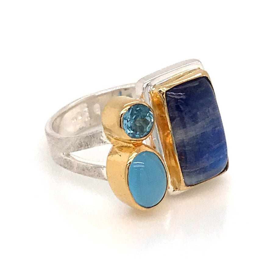 Two-Tone Sterling Silver & 22 Karat Yellow Gold Ring with Rainbow Blue Moonstone, One Round Blue Topaz and One Oval Blue Agate. Ring Size 7By local Lake Tahoe designer Michou!Can be special ordered or re-sized per request. Please contact for more details.