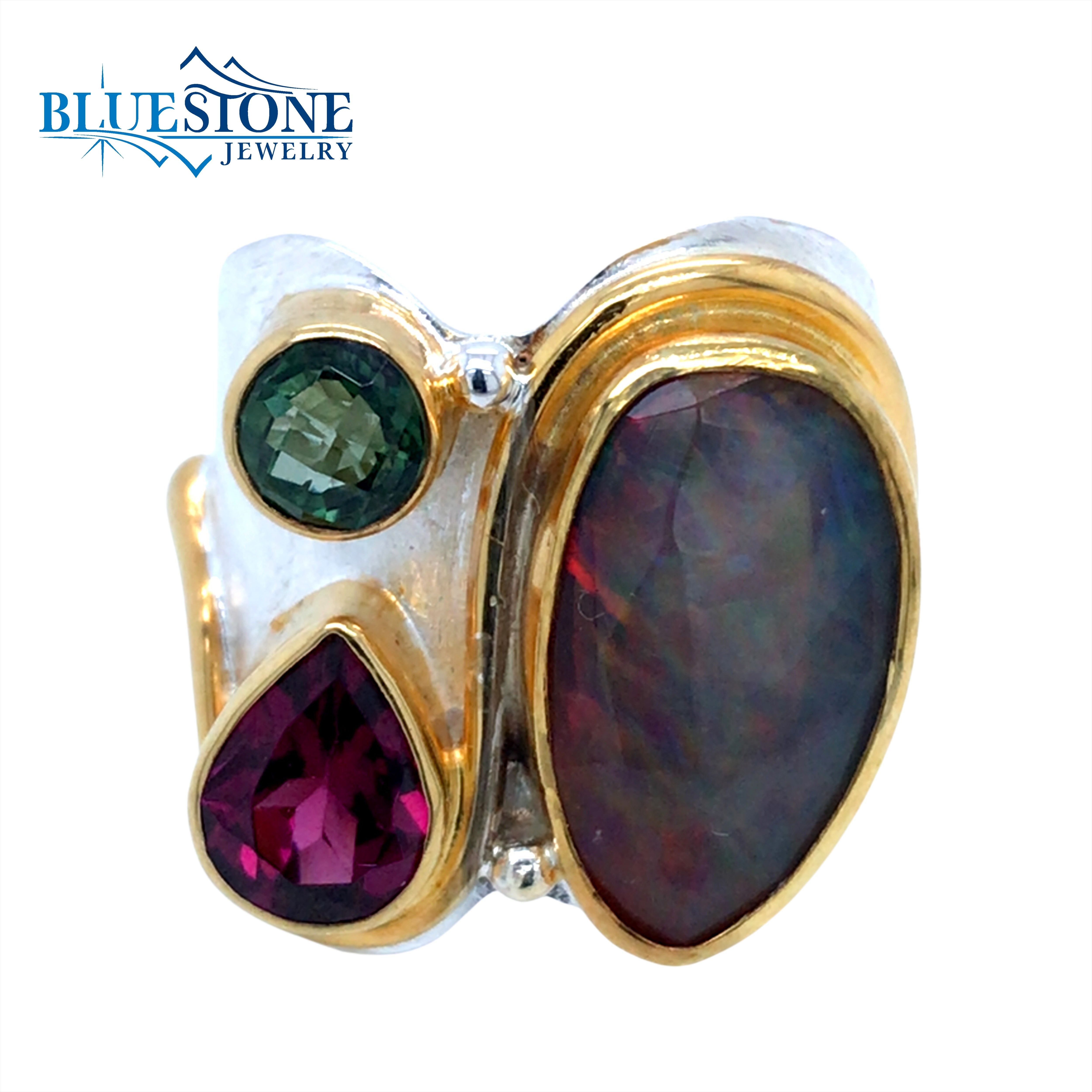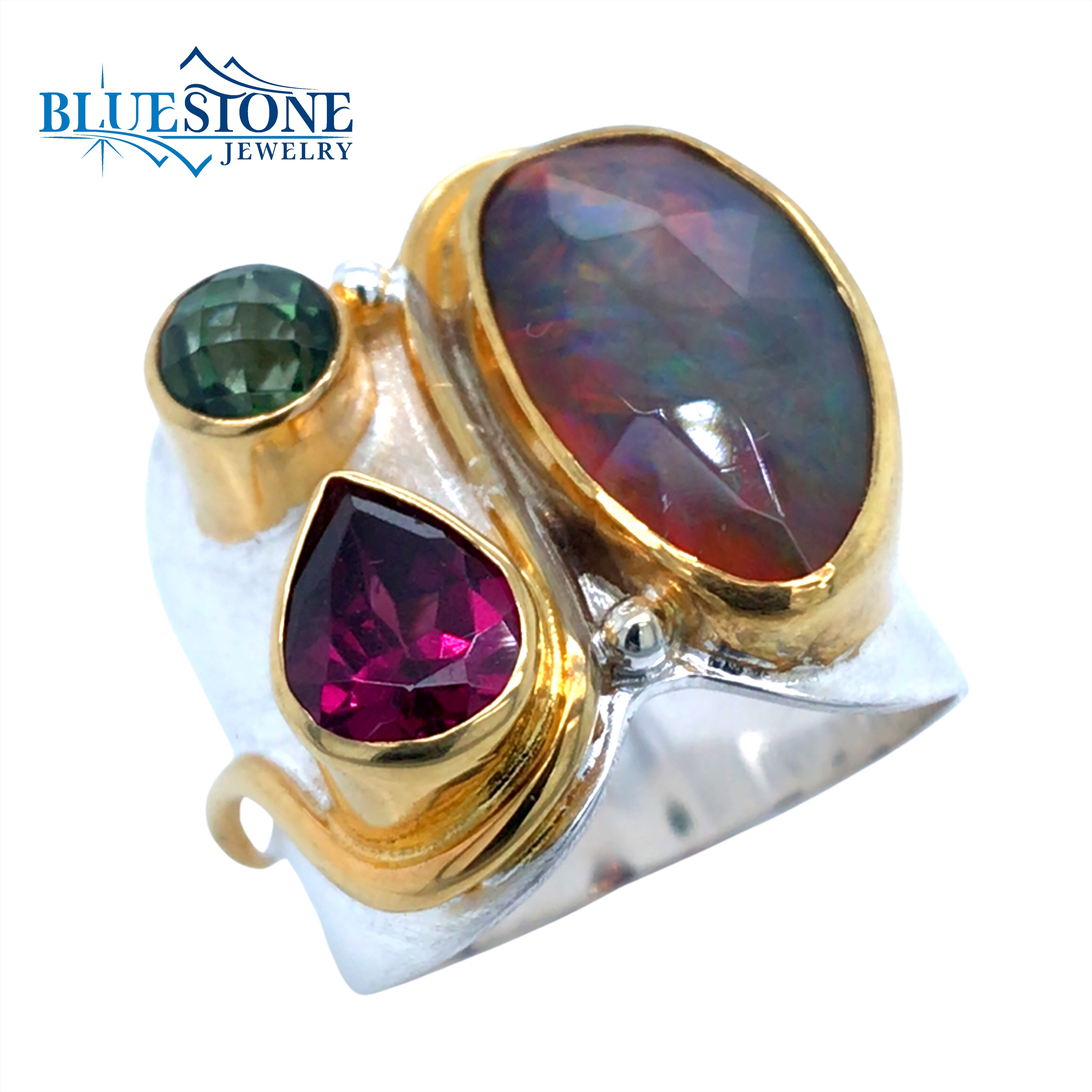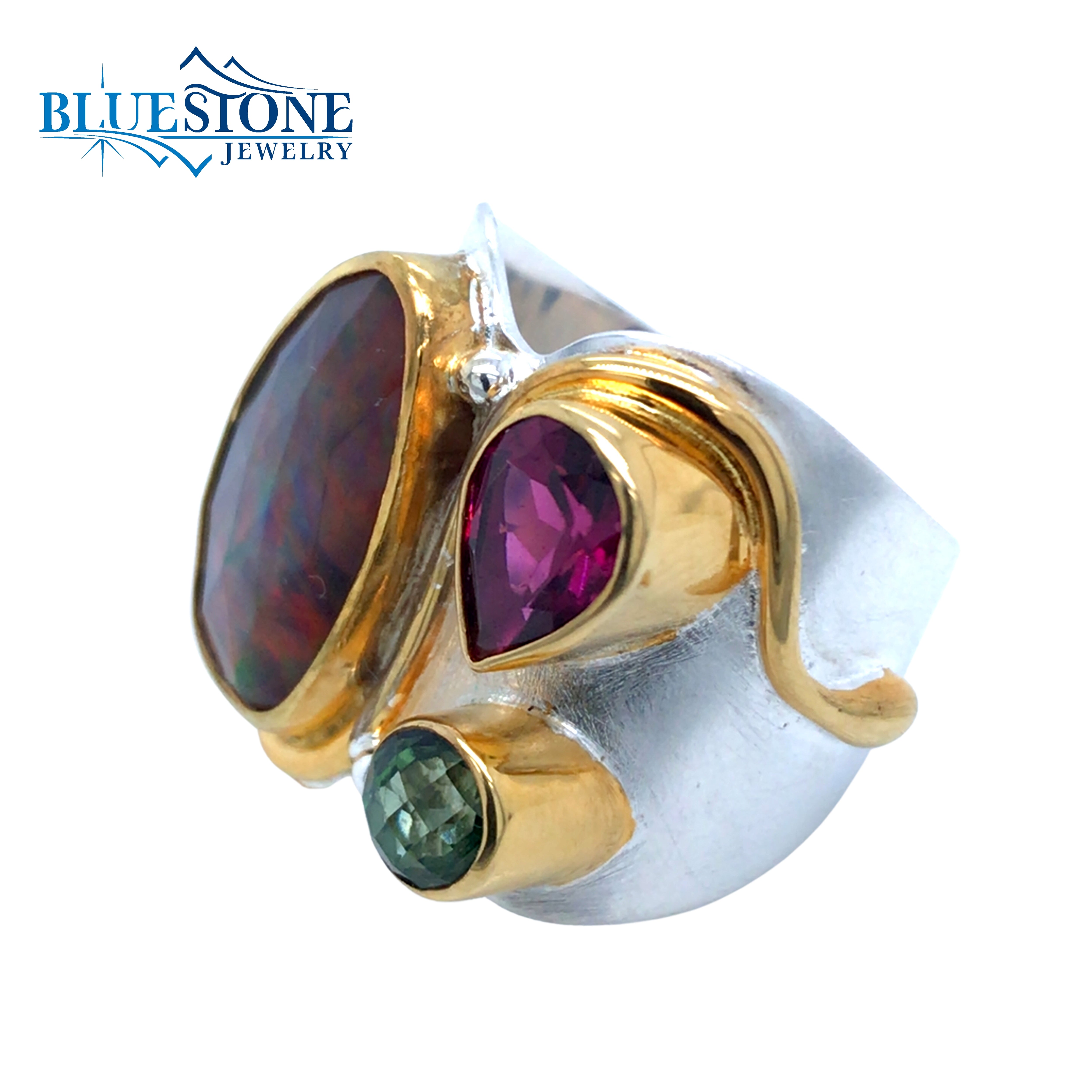 One-of-a-Kind Two-Tone Sterling Silver and 22 Karat Yellow Gold Vermeil Ring with One 9mm x 15mm Smoked Ethiopian Opal, One 5.5mm x 8mm Pear Cut Rhodalite Garnet and One 5mm Round Envy Green Topaz.Ring Size 6.75. Due to the width of the ring, it may fit like a ring size 6.5.By local Lake Tahoe designer Michou!