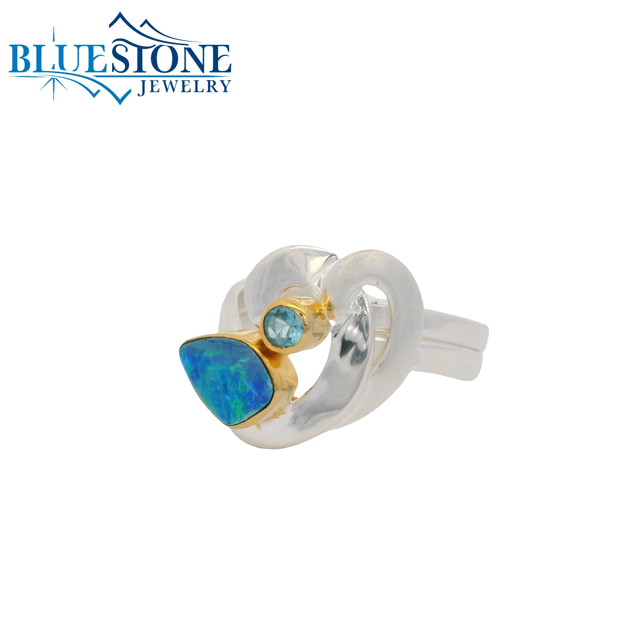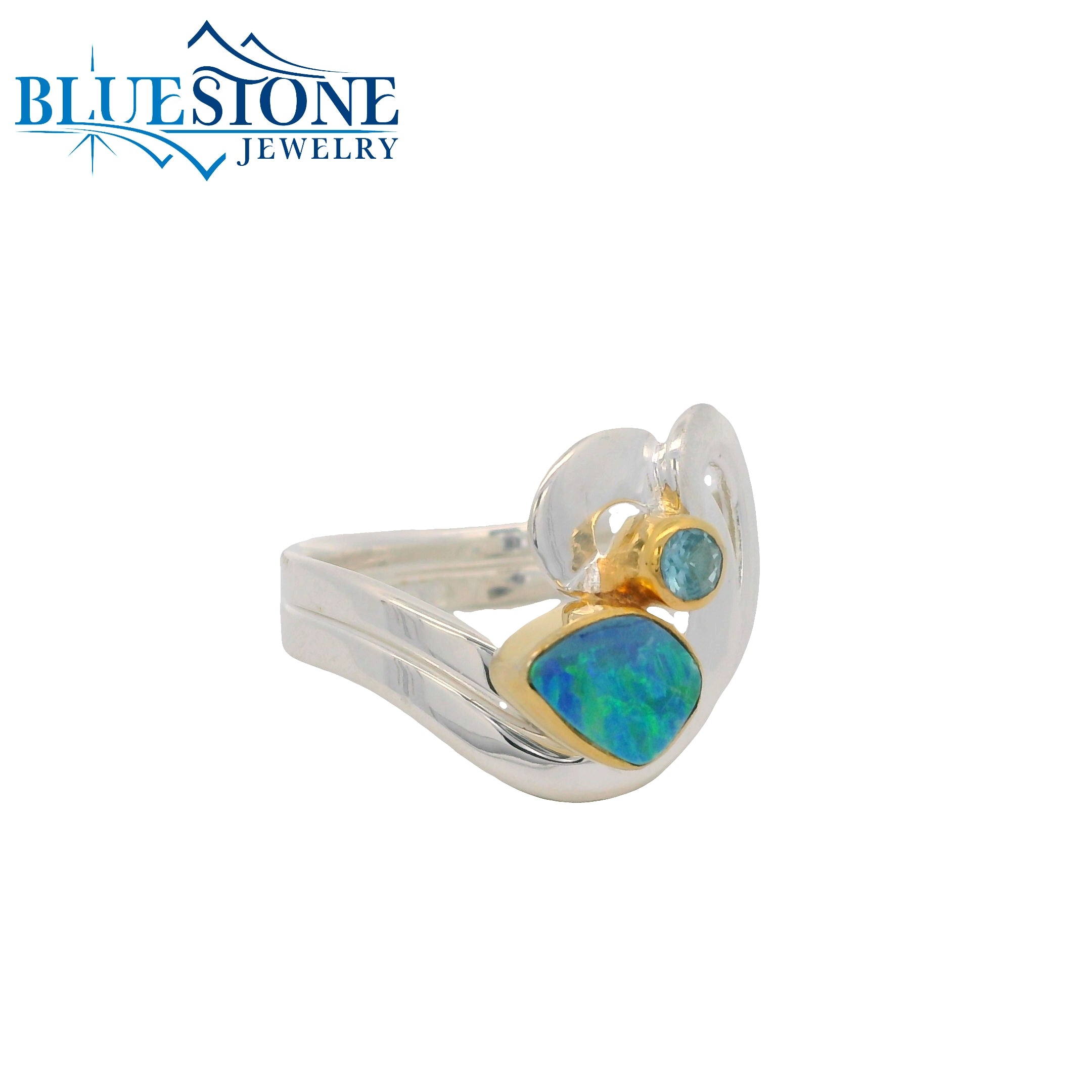 Sterling Silver and 22 Karat Yellow Gold Vermeil Double Wave Band Ring with One Various Shaped Opal and One Round Baby Blue Topaz Gemstone. Ring Size 8.Local Lake Tahoe Artist Michou.