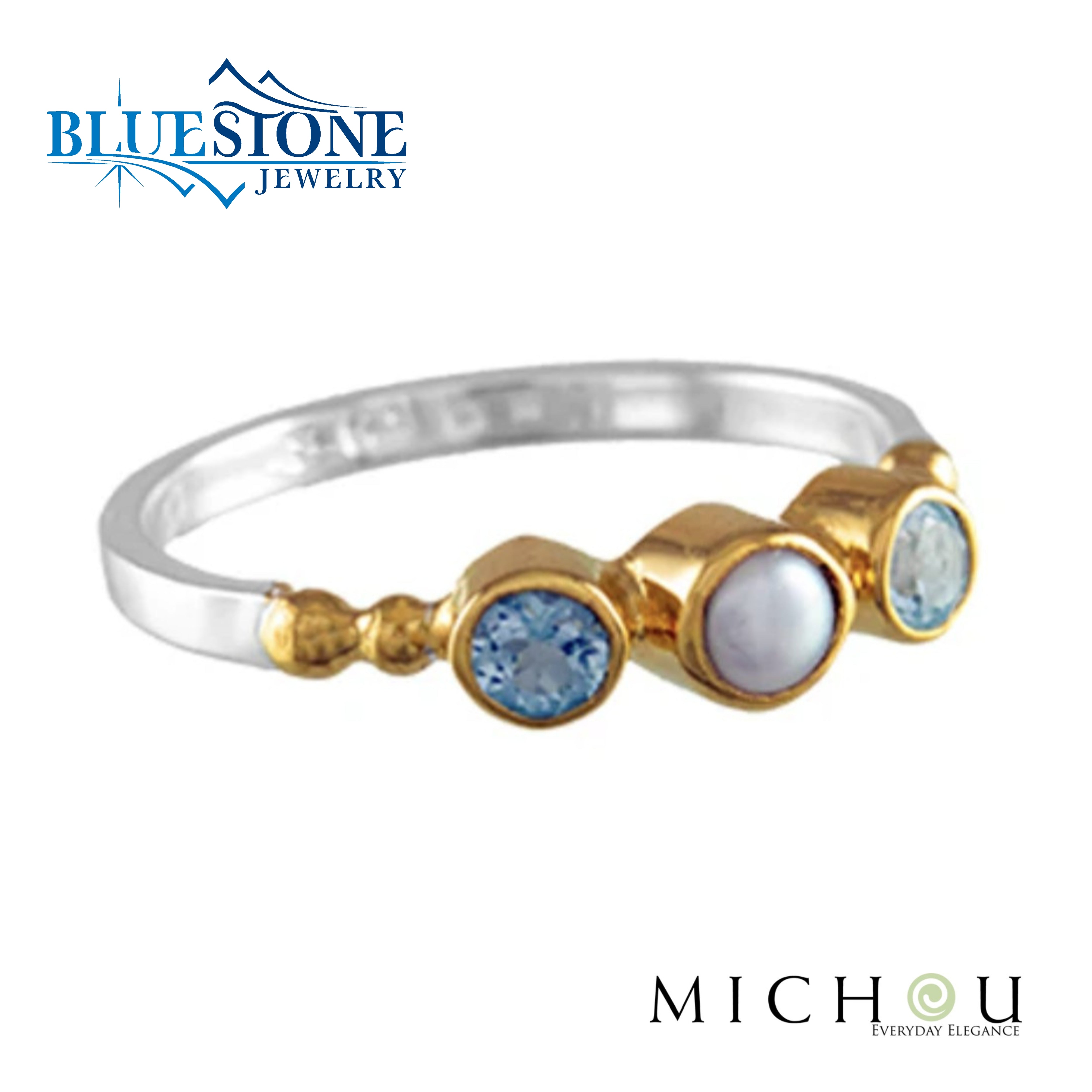 Sterling Silver and 22 Karat Yellow Gold Vermeil Ring with One Freshwater Pearl and Two Sky Blue Topaz Gemstones. Ring Size 8.Local Lake Tahoe Artist Michou.