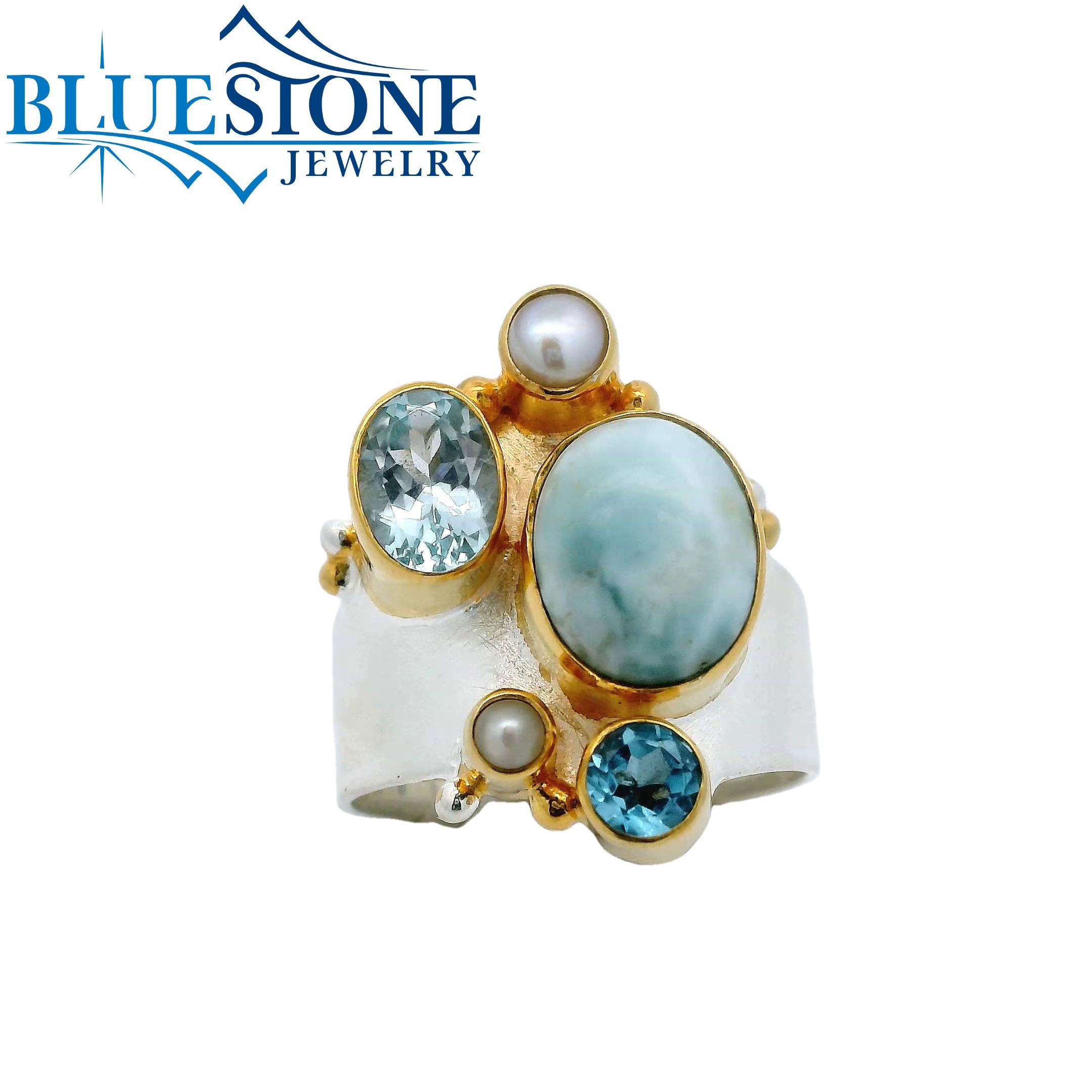 Two-Tone Sterling Silver & 22 Karat Yellow Gold Vermeil Fashion Ring with Two Fresh Water Pearls, One Oval Larimar & Two Blue Topaz.Ring Size 6.Can be special ordered or re-sized per request. Please contact for details.By local Lake Tahoe designer Michou!