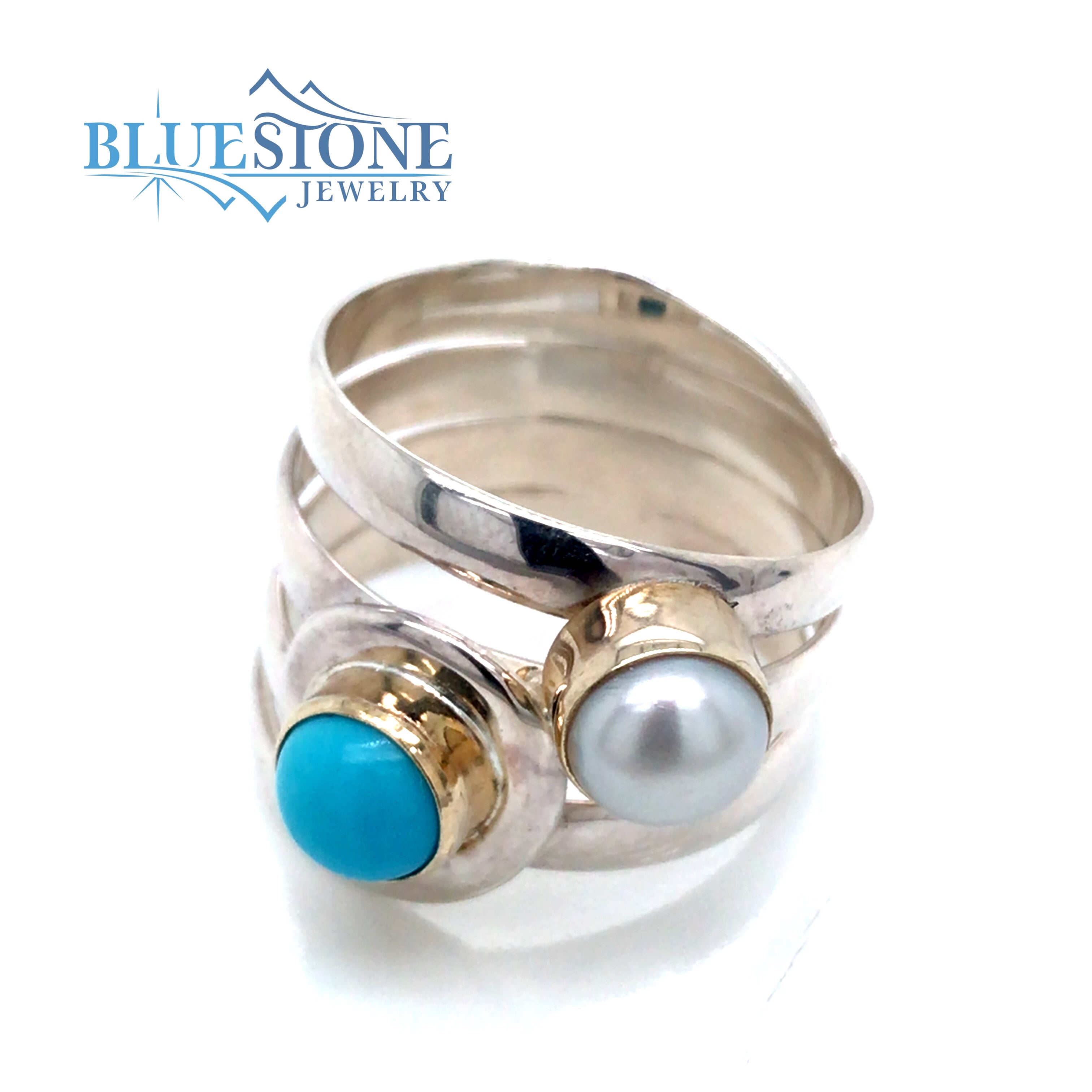 Two-Tone Sterling Silver and 22 Karat Yellow Gold Vermeil Ring with One Turquoise and One Pearl.Ring Size 8.Can be special ordered or resized per request. Please contact for details.By local Lake Tahoe designer Michou!