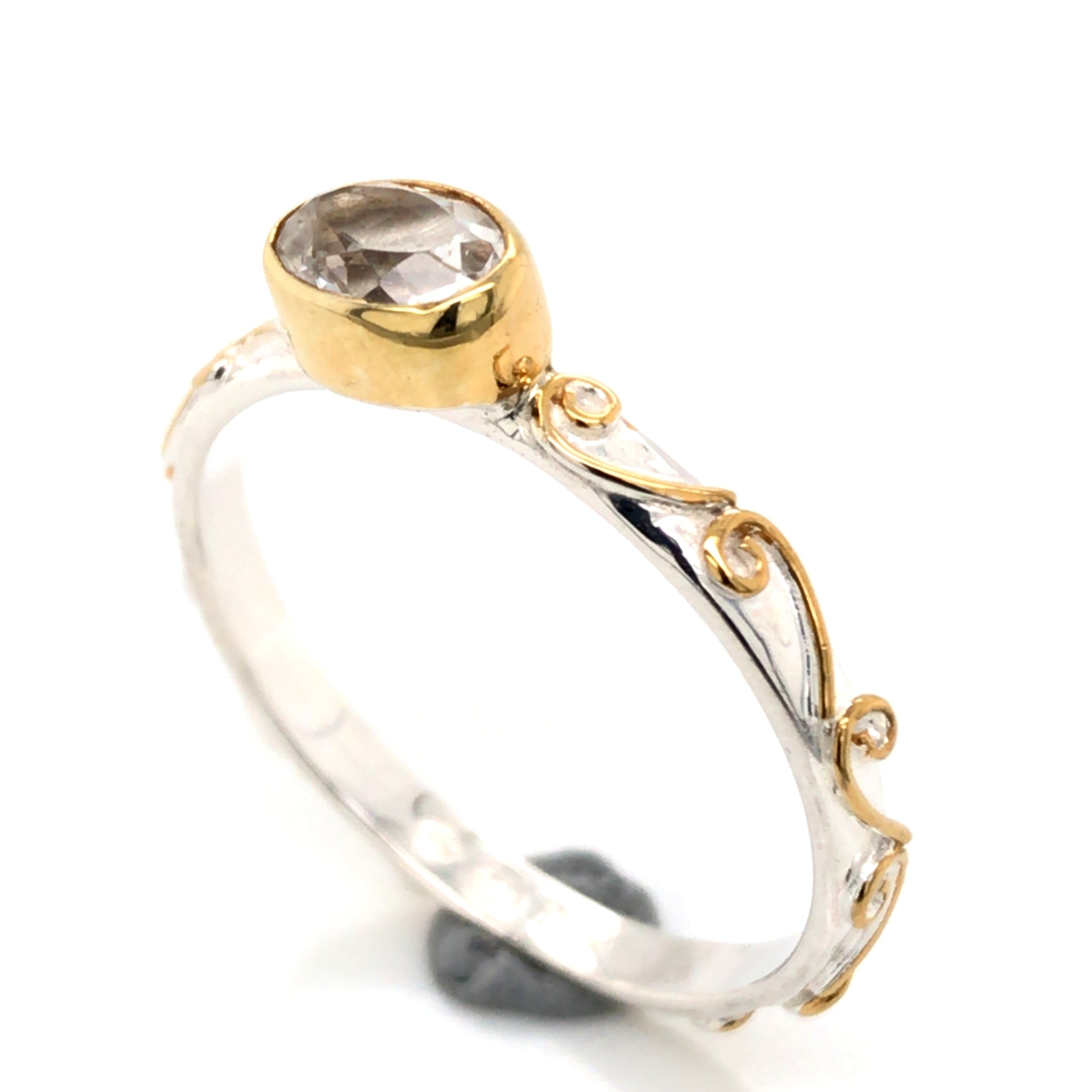 Two-Tone Sterling Silver & 22 Karat Yellow Gold Verrmeil Satin Finish Geometric Ring with One 4mm x 6mm Oval White Topaz.Rings Size 7.By local Lake Tahoe designer Michou!Can be special ordered or re-sized per request (additonal charge may apply). Please contact for details.