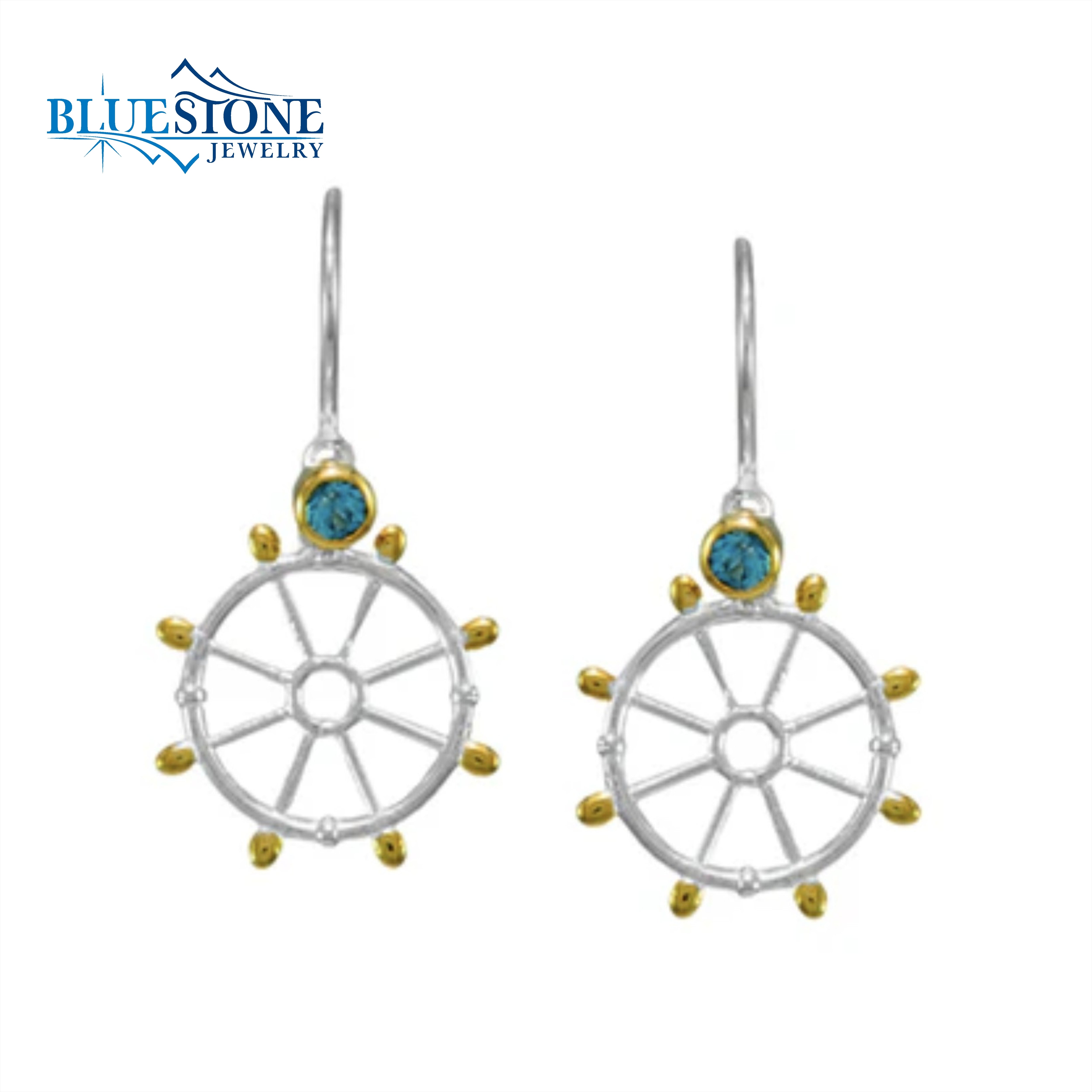 Sterling Silver with 22 Karat Yellow Gold Vermeil Accent Ship's Wheel Earrings with Two 3mm Round Cut Blue Topaz Gemstones. Earrings Measure 1.25" Long. Made by Local Lake Tahoe Artist Michou.