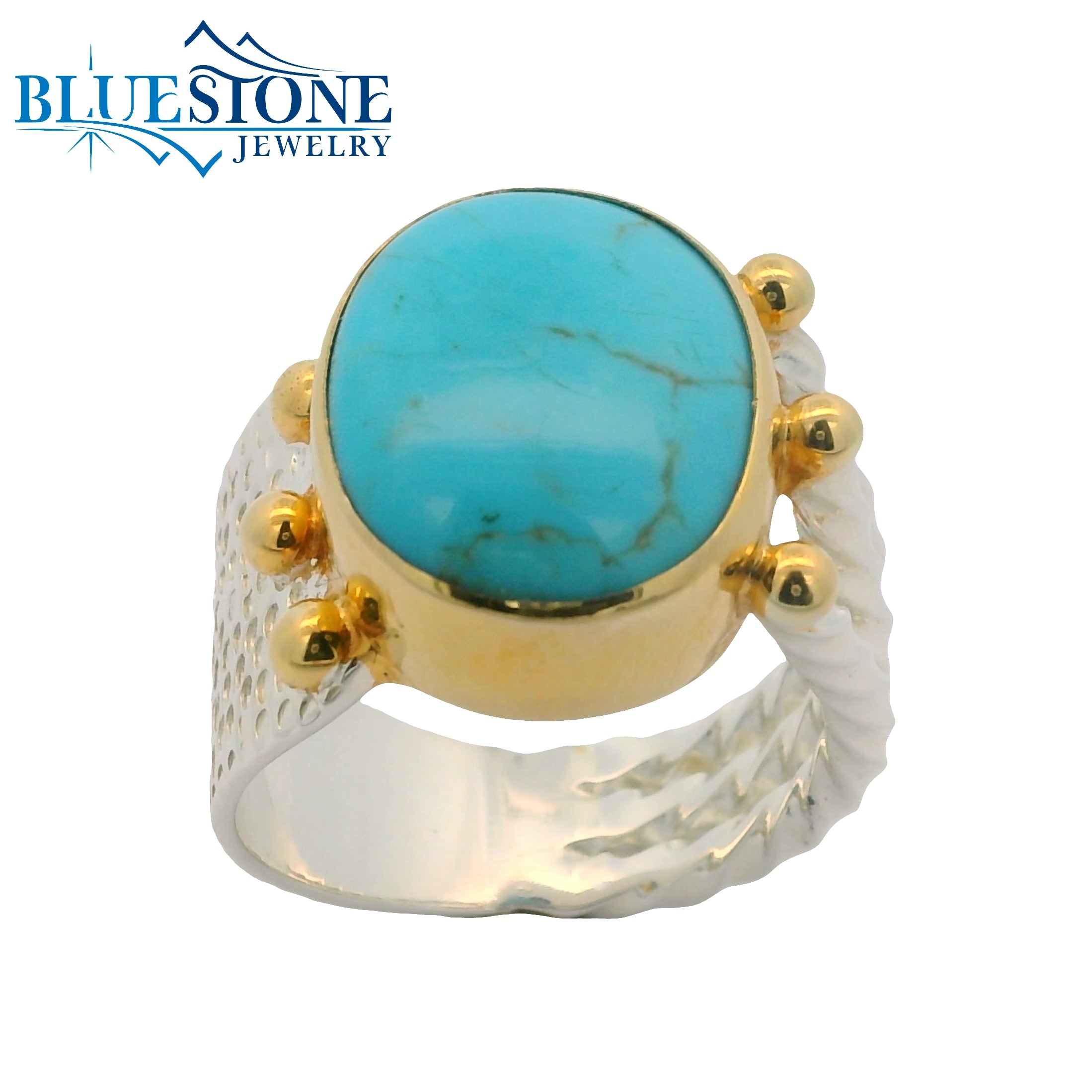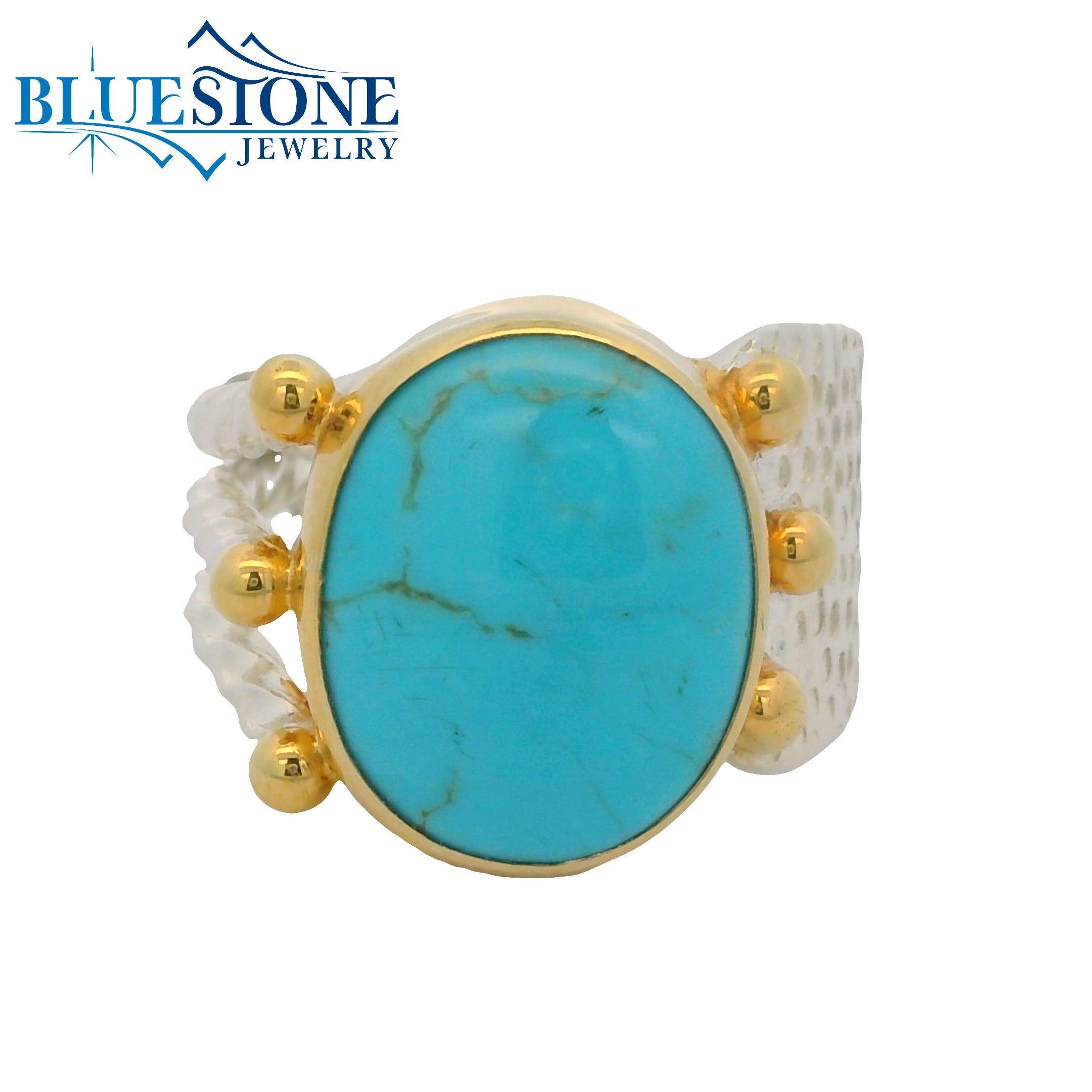 Sterling Silver and 22 Karat Yellow Gold One-of-a-Kind Ring with One 12mm x 16mm Oval Turquoise Stone. Ring Size 9.Local Lake Tahoe Artist Michou.