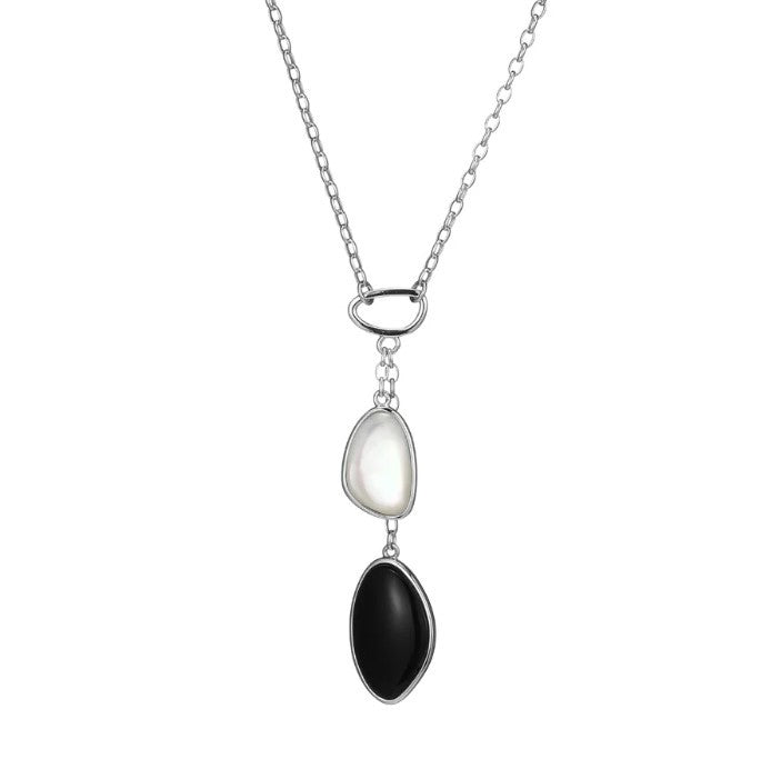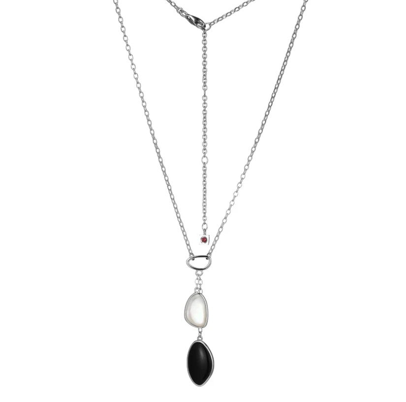 Sterling Silver Rhodium Plated Necklace with One Genuine Black Agate, One White Mother of Pearl and One Hidden Round Created Ruby which represents inner beauty, inner peace & inner strength. Pendant Measures 2 Inches Long. Comes Fixed to a 20 Inch Rolo Chain. Can be worn between 17 to 20 inches.