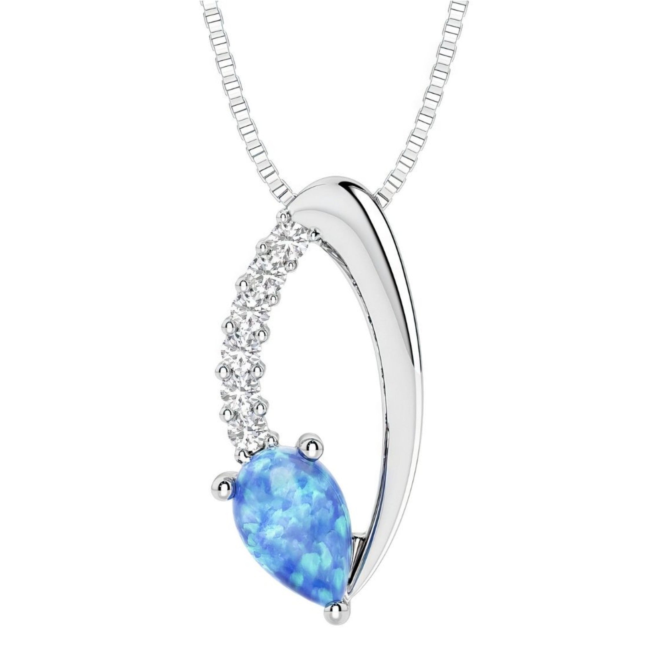 Sterling Silver Rhodium Plated Pendant with One 8mm x 5mm 0.43 Carat Pear Cut Lab Created Blue Opal and Six 1.8mm Round Cut Lab Created Diamonds at 0.15 Total Carat Weight. Pendant Measures 7/8" x 3/8". Comes on a Sterling Silver Rhodium Plated 20 Inch Rolo Chain. Can be worn between 17" and 20".