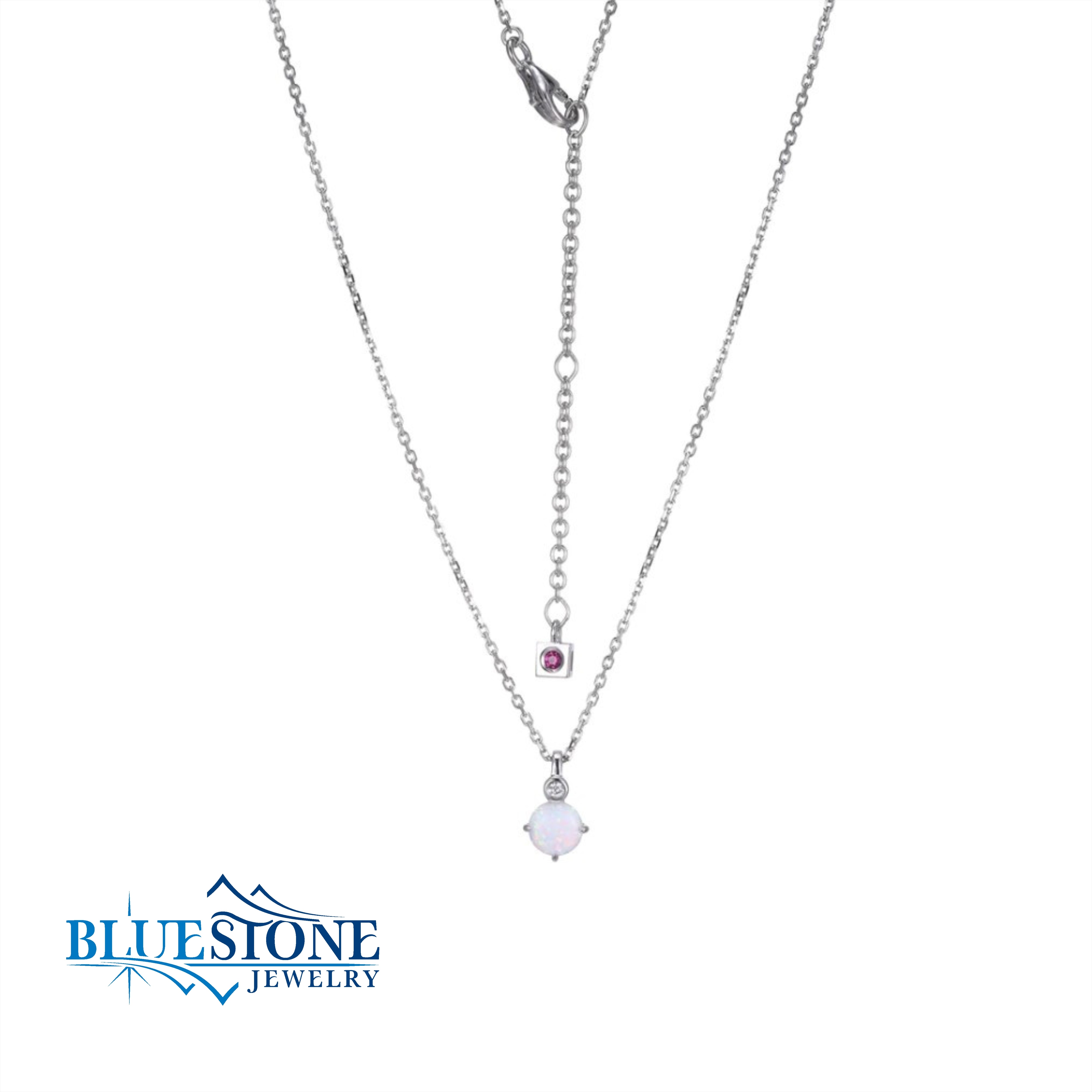 Sterling Silver Rhodium Plated October Birthstone Pendant with One 6mm Round Lab Created Opal and One Round Lab Grown Diamond at 0.02 Total Carat Weight. Features One Hidden Round Created Ruby which represents inner beauty, inner peace & innerstrength. Comes on a 19 Inch 1.9mm Faceted Crossed Diamond Cut Cable Chain. Can be worn at lengths between 17 to 19 inches.