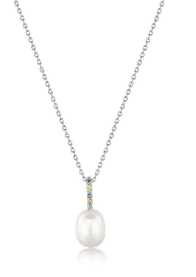 Sterling Silver Rhodium Plated Oval Necklace With 16 Colored Cubic Zirconia Gemstones Encrusted Along Front And Back Of Bail On Pendant.Necklace Length Is 18" Plus An Additional 2" Extender. Total Length 20".