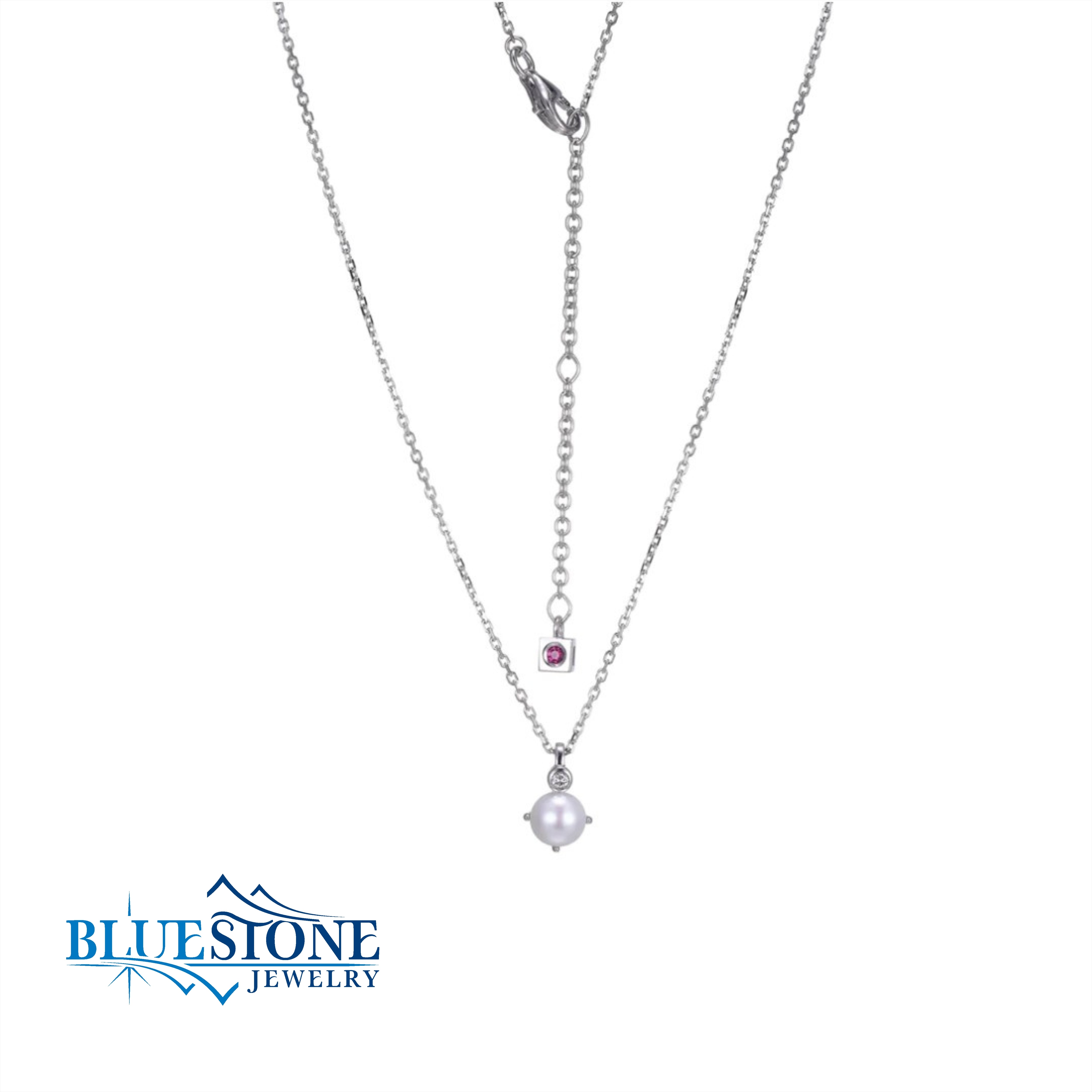 Sterling Silver Rhodium Plated June Birthstone Pendant with One 6mm Round Pearl and One Round Lab Grown Diamond at 0.02 Total Carat Weight. Features One Hidden Round Created Ruby which represents inner beauty, inner peace & innerstrength. Comes on a 19 Inch 1.9mm Faceted Crossed Diamond Cut Cable Chain. Can be worn at lengths between 17 to 19 inches.