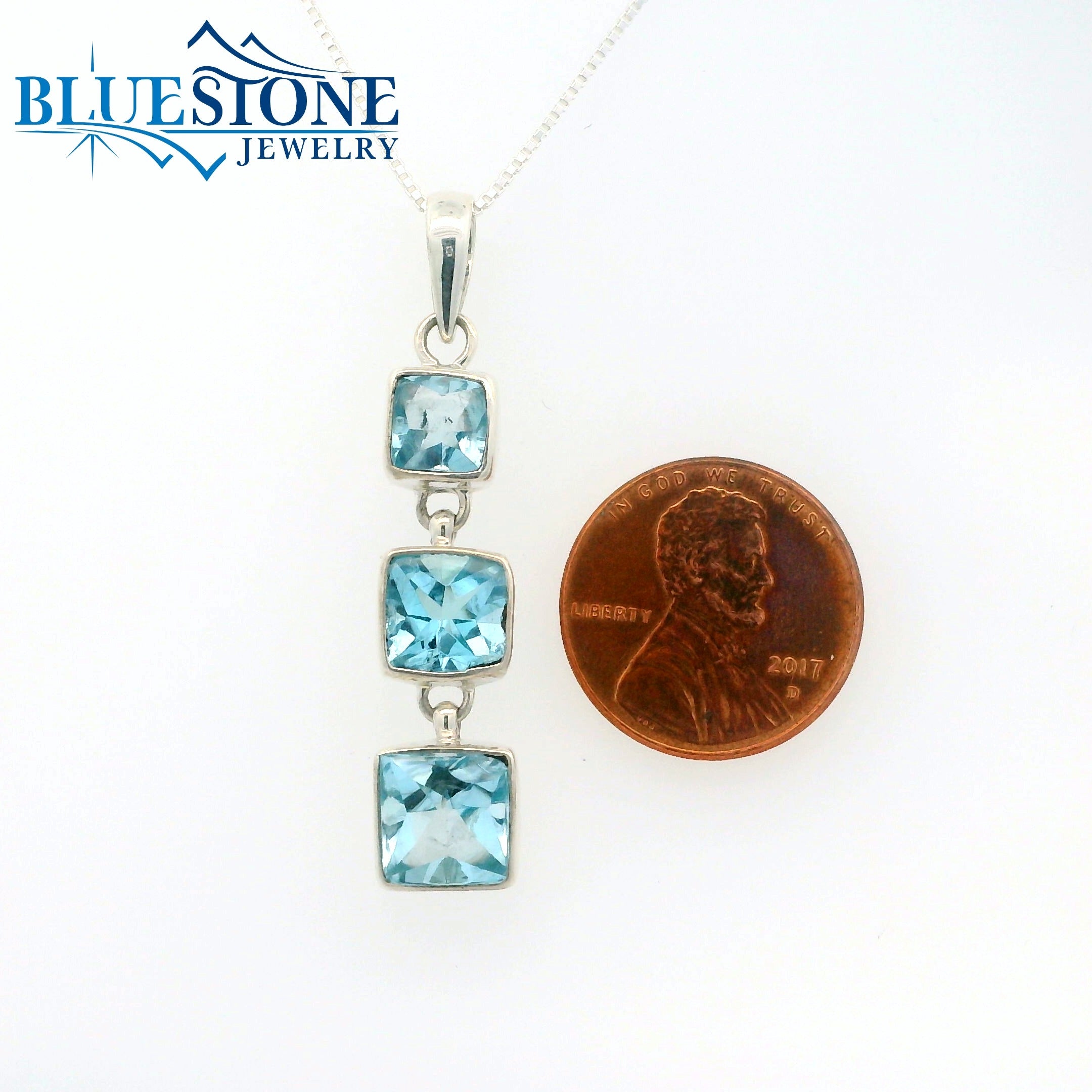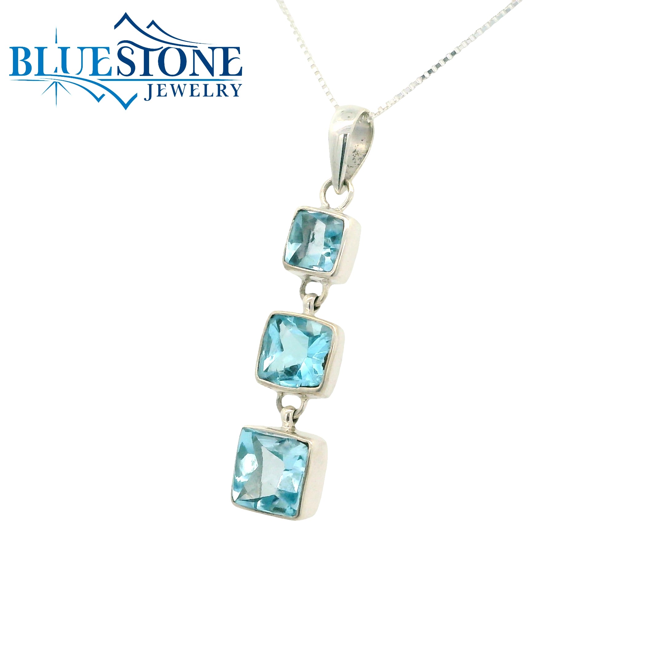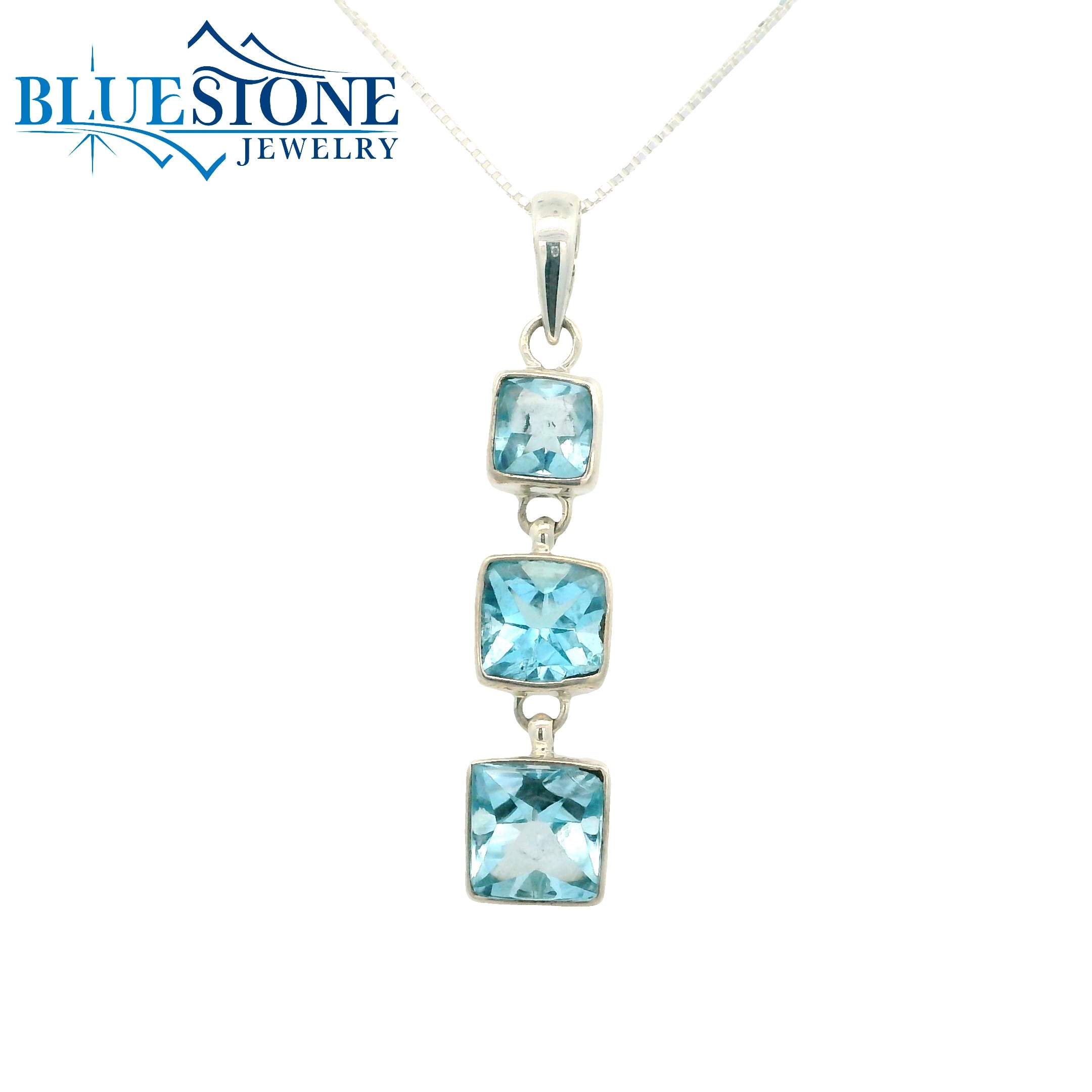 Sterling Silver Rhodium Plated Pendant with Three Square Cut Sky Blue Topazes. Pendant Comes on an 18 Inch Sterling Silver Box Chain.