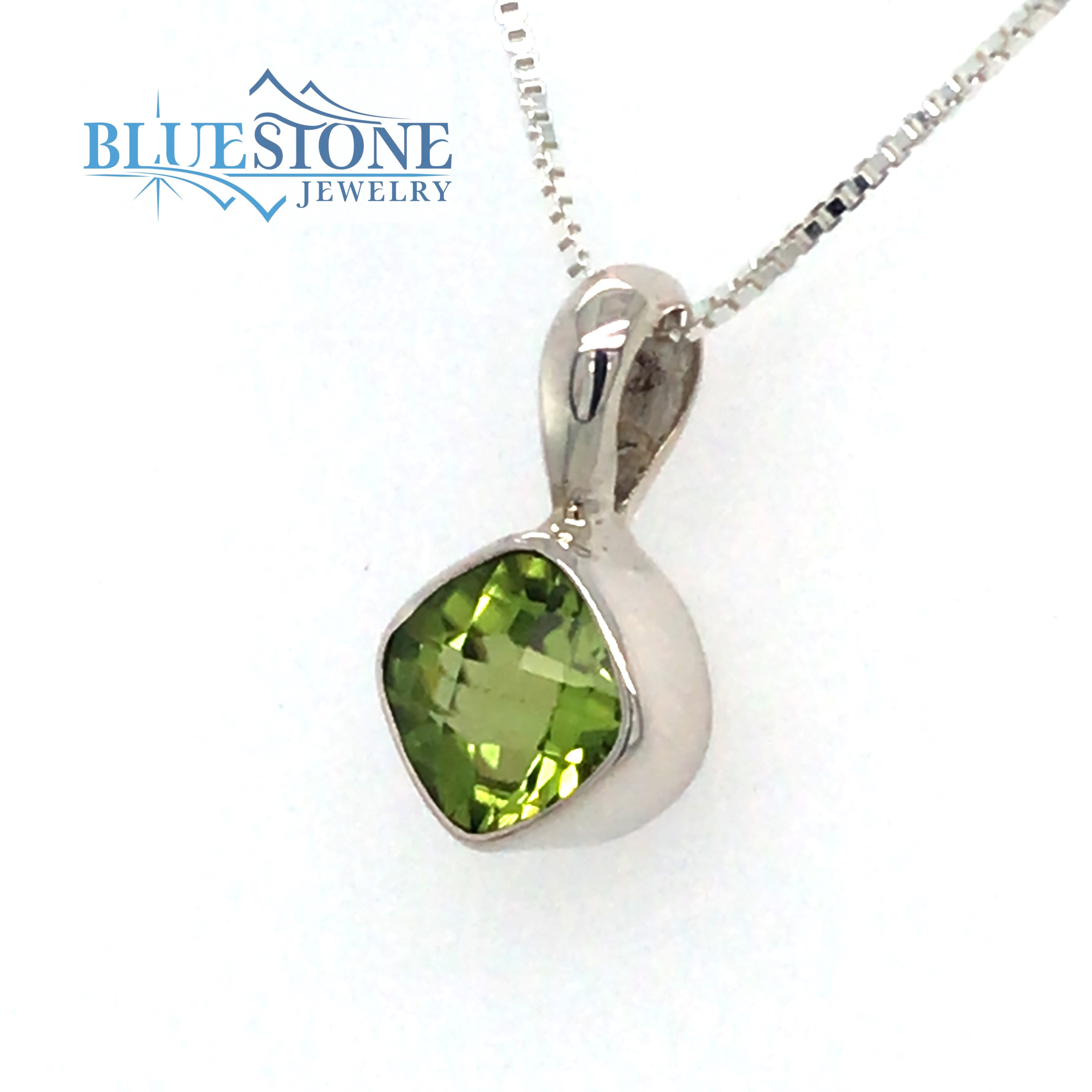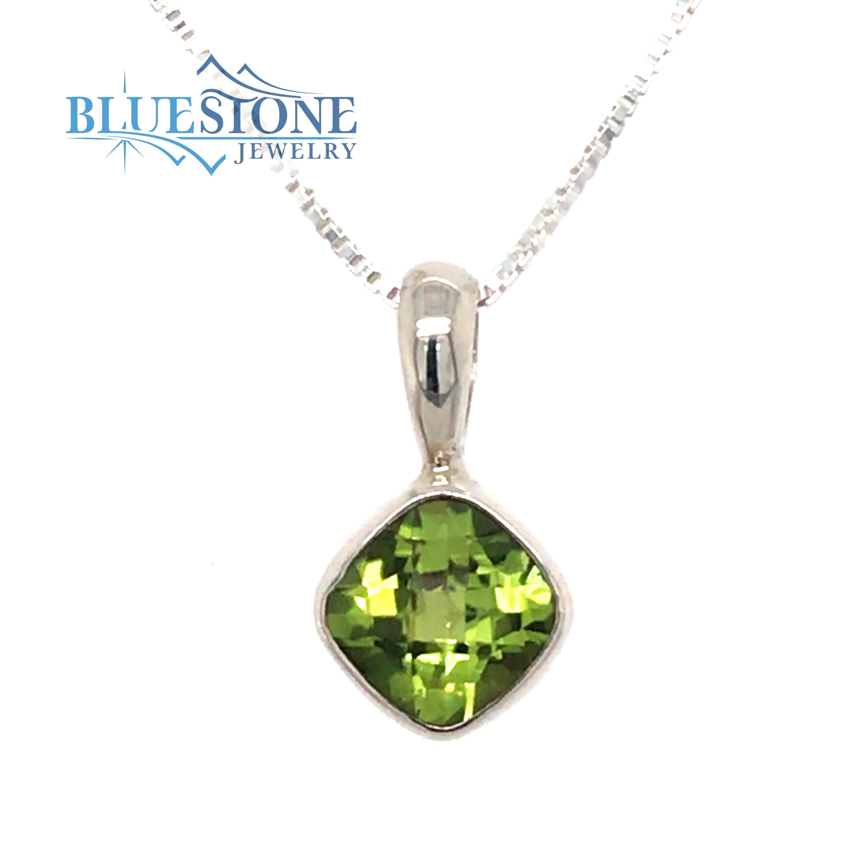 Sterling Silver Rhodium Plated Pendant with One 6mm Square Cushion Cut Peridot. Comes on an 18 Inch Silver Box Chain.