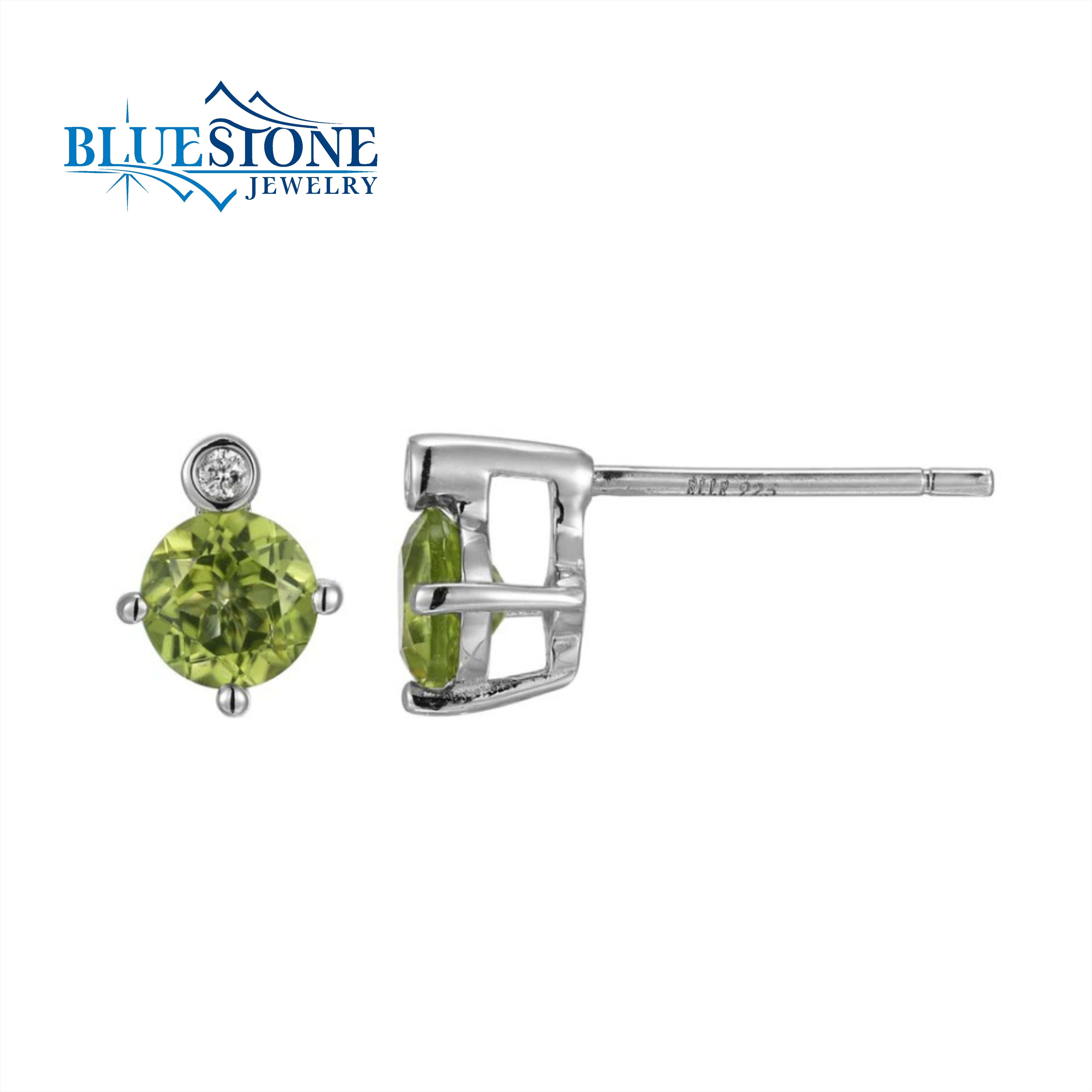 Sterling Silver Rhodium Plated August Birthstone Stud Earrings with Two 5mm Round Peridots and Two 0.8mm Round Lab Grown Diamonds at 0.02 Total Carat Weight F/C H-I/I1 Quality. Also Feature Two Hidden Round Created Rubies which represent inner beauty, inner peace & inner strength.