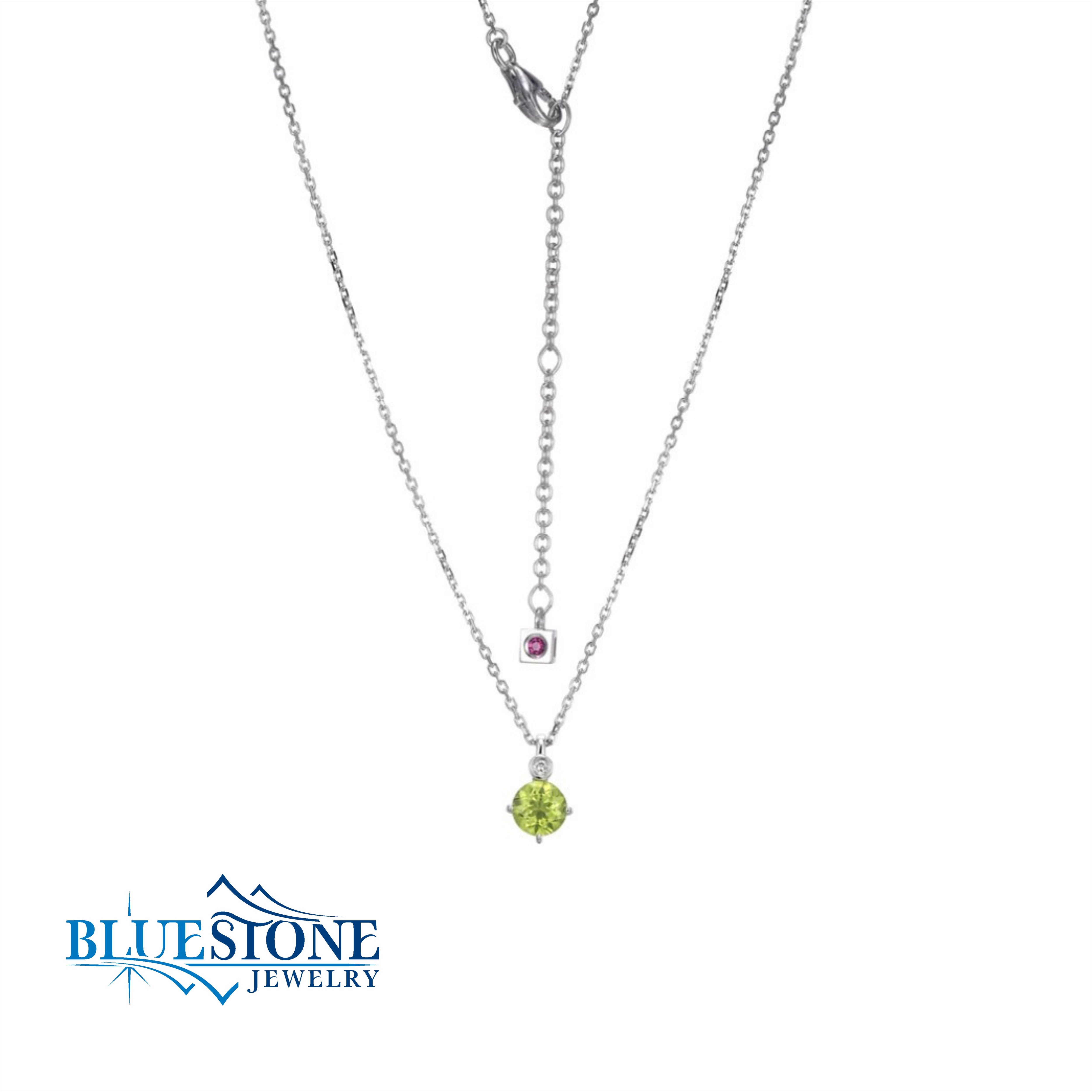 Sterling Silver Rhodium Plated August Birthstone Pendant with One 6mm Round Peridot and One Round Lab Grown Diamond at 0.02 Total Carat Weight. Features One Hidden Round Created Ruby which represents inner beauty, inner peace & inner strength. Comes on a 19 Inch 1.9mm Faceted Crossed Diamond Cut Cable Chain. Can be worn at lengths between 17 to 19 inches.