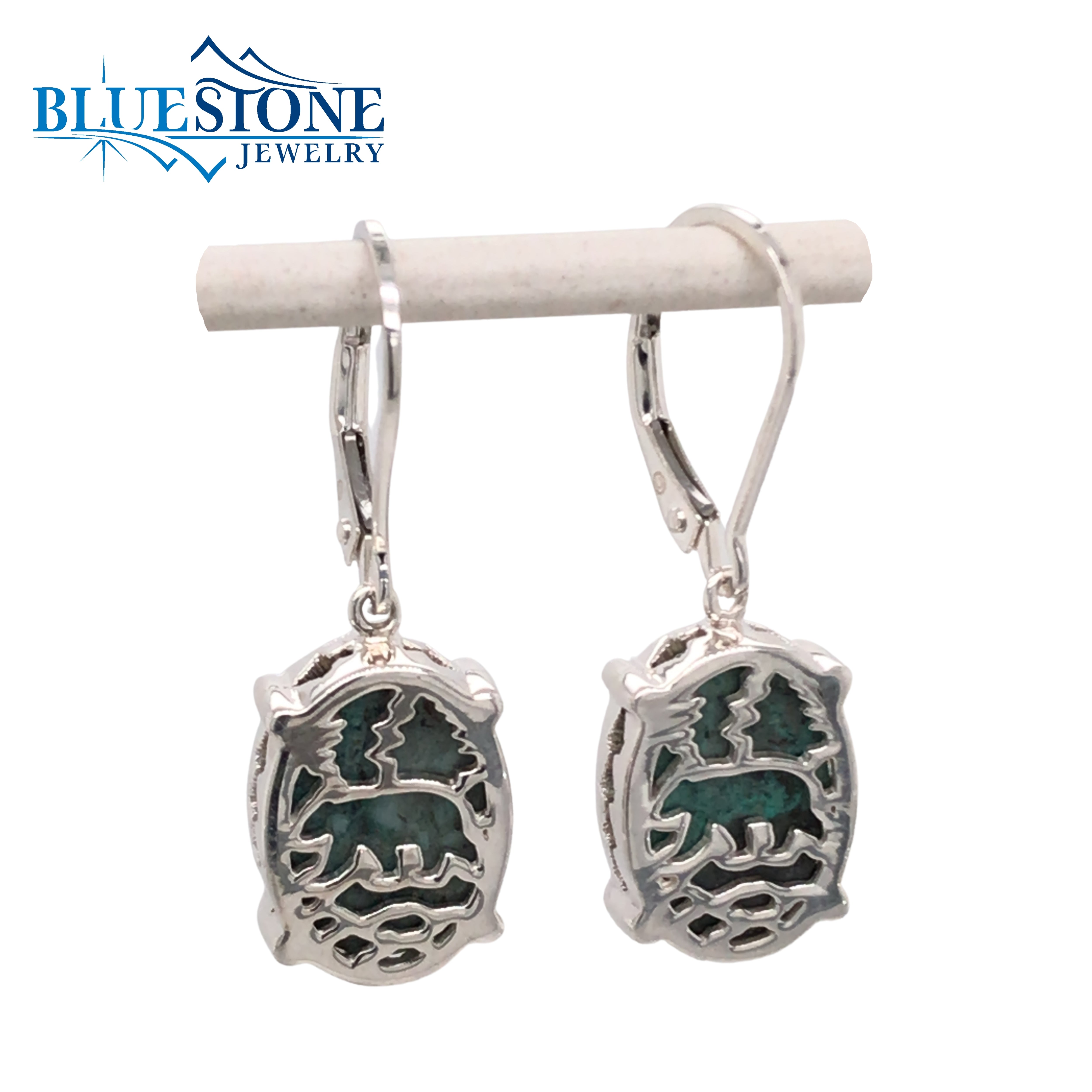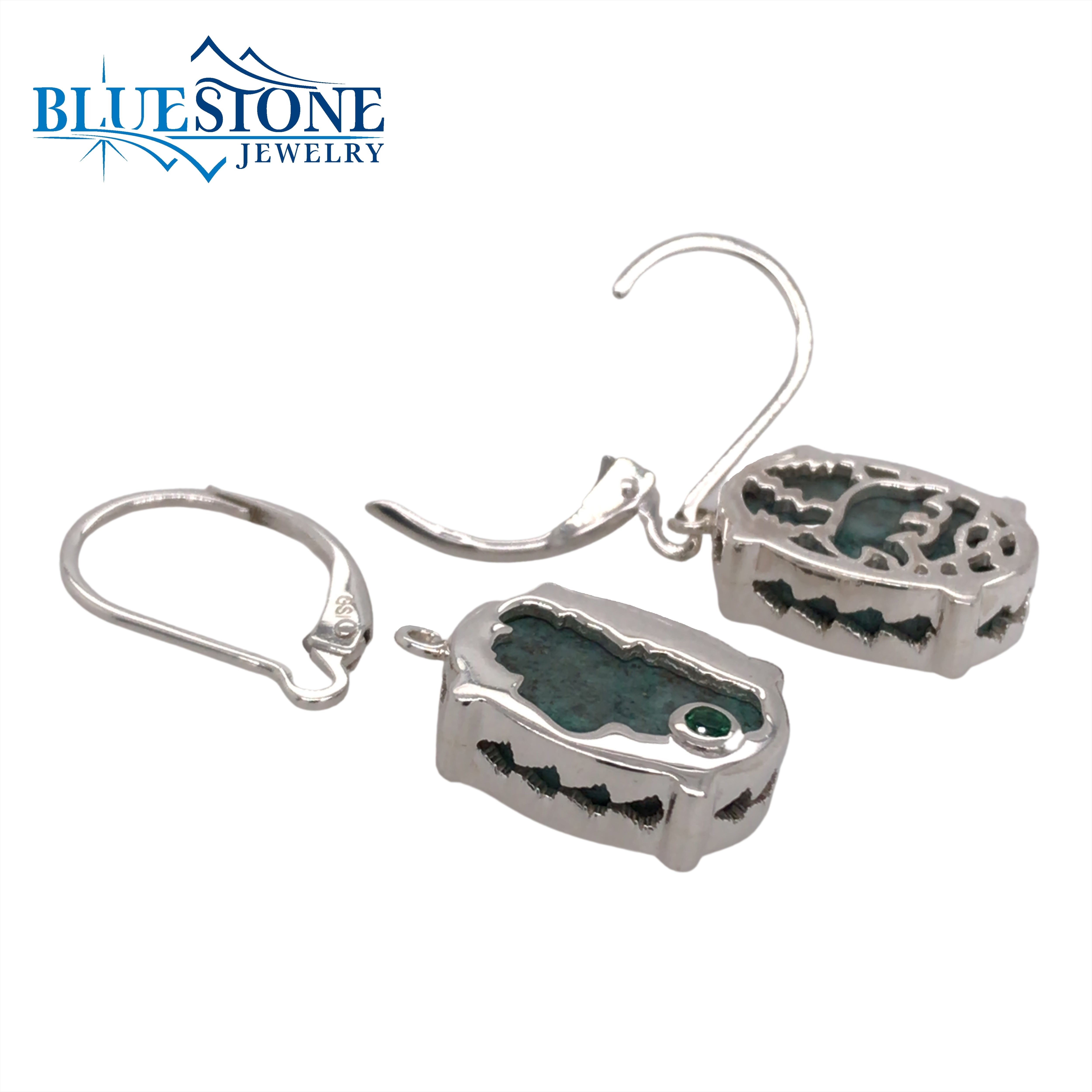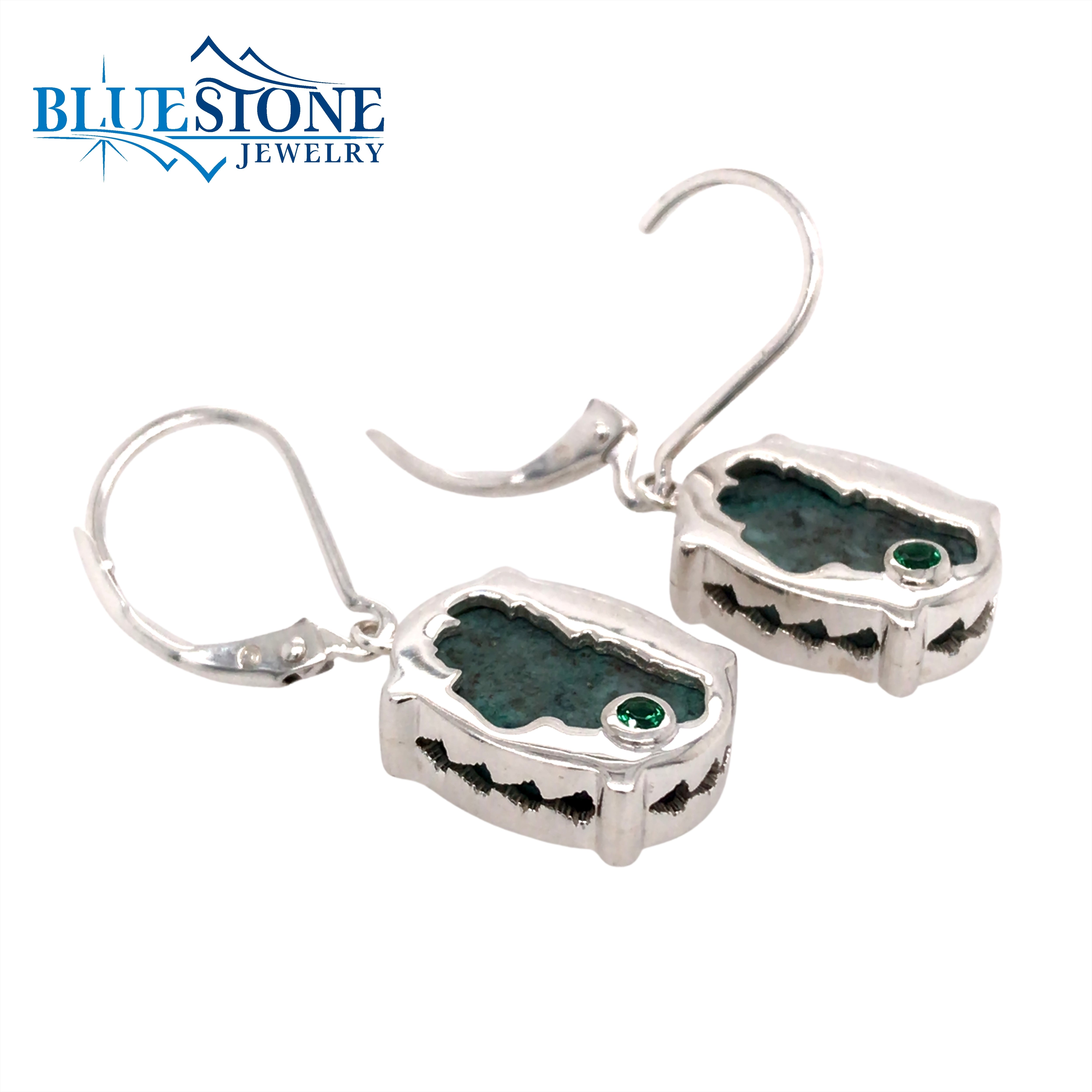 Sterling Silver Reversible Lake Tahoe/Bear Leverback Earrings with 2 Tahoe Locally Mined Chrysocolla (center gemstone) & 2 Lab-Grown Emeralds at the Location of Emerald Bay, CA. Can easily be worn with either the Lake Tahoe side or the Bear side facing forward! Measure approximately 1 1/8th of an inch tall & 3/8 of an inch wide.Bluestone Exclusive Design.