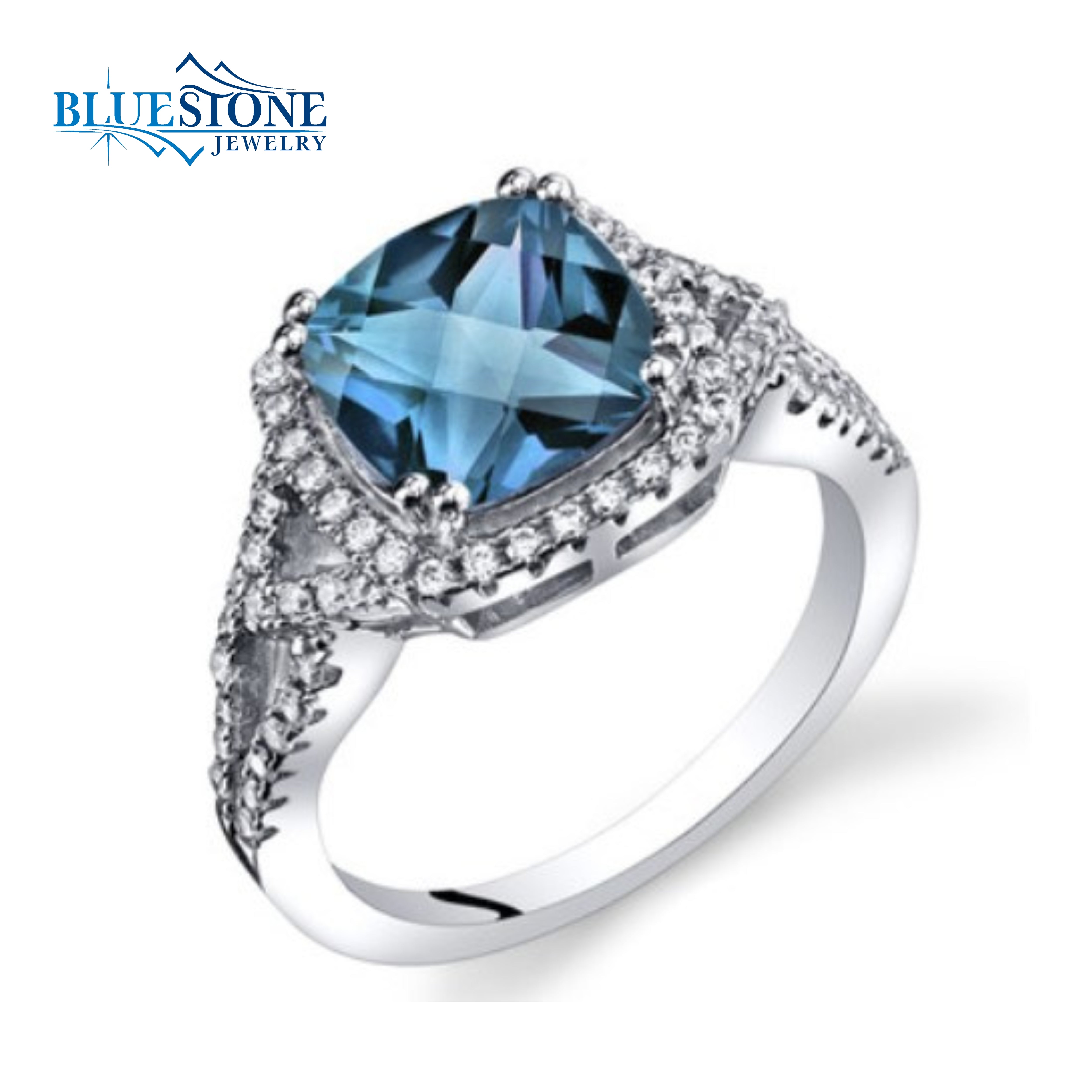 Sterling Silver Rhodium Plated Ring with One 2.75 Carat 8mm x 8mm Cushion Cut London Blue Topaz and 62 Cubic Zirconias.Ring Size 8.Other Ring Sizes are Available.