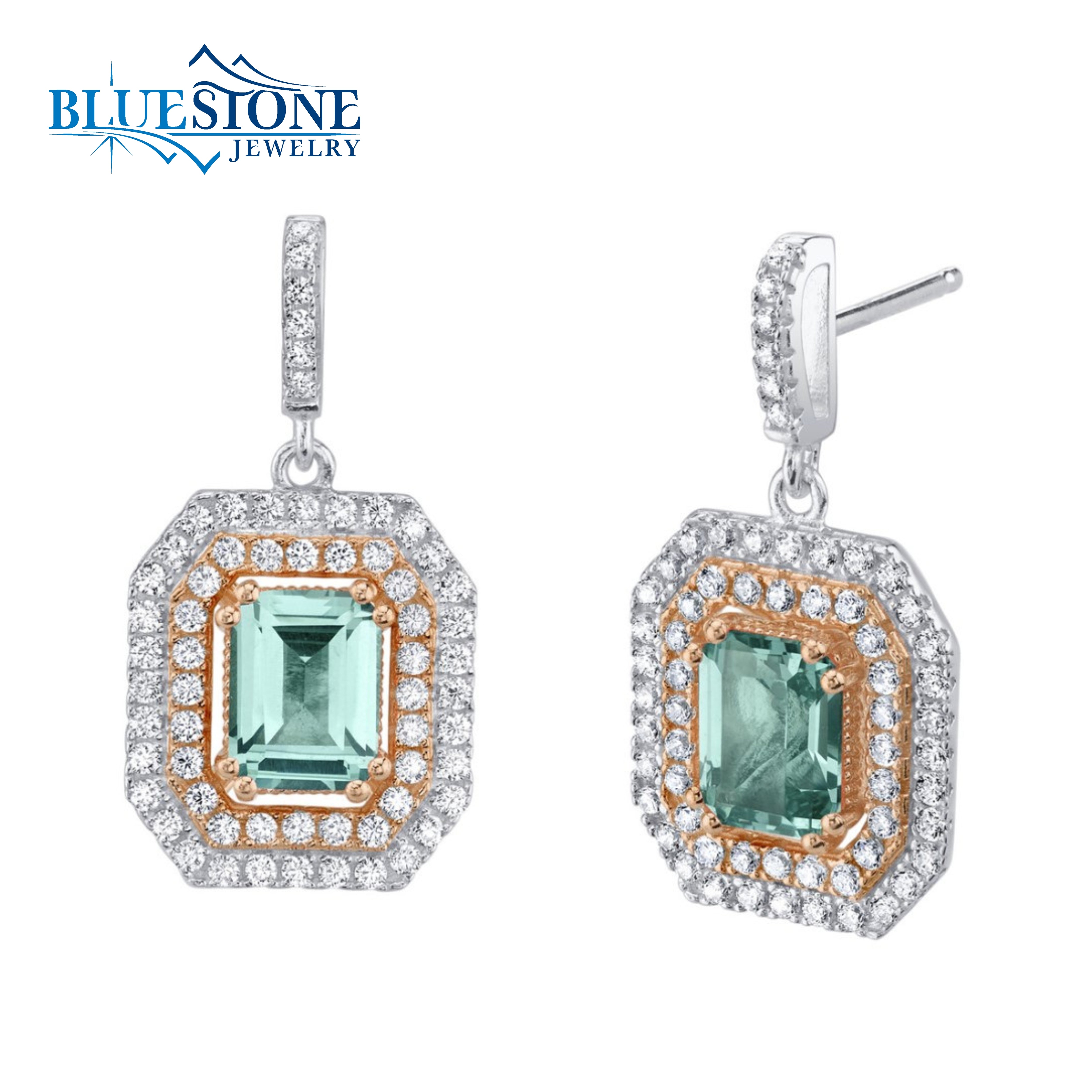 Sterling Silver with Rhodium and 14 Karat Rose Gold Plating Post Drop Earrings with Two 2.00 Carat 8mm x 6mm Octagon Cut Simulated Tourmaline and 124 Cubic Zirconias. Measure 1 inch Long.