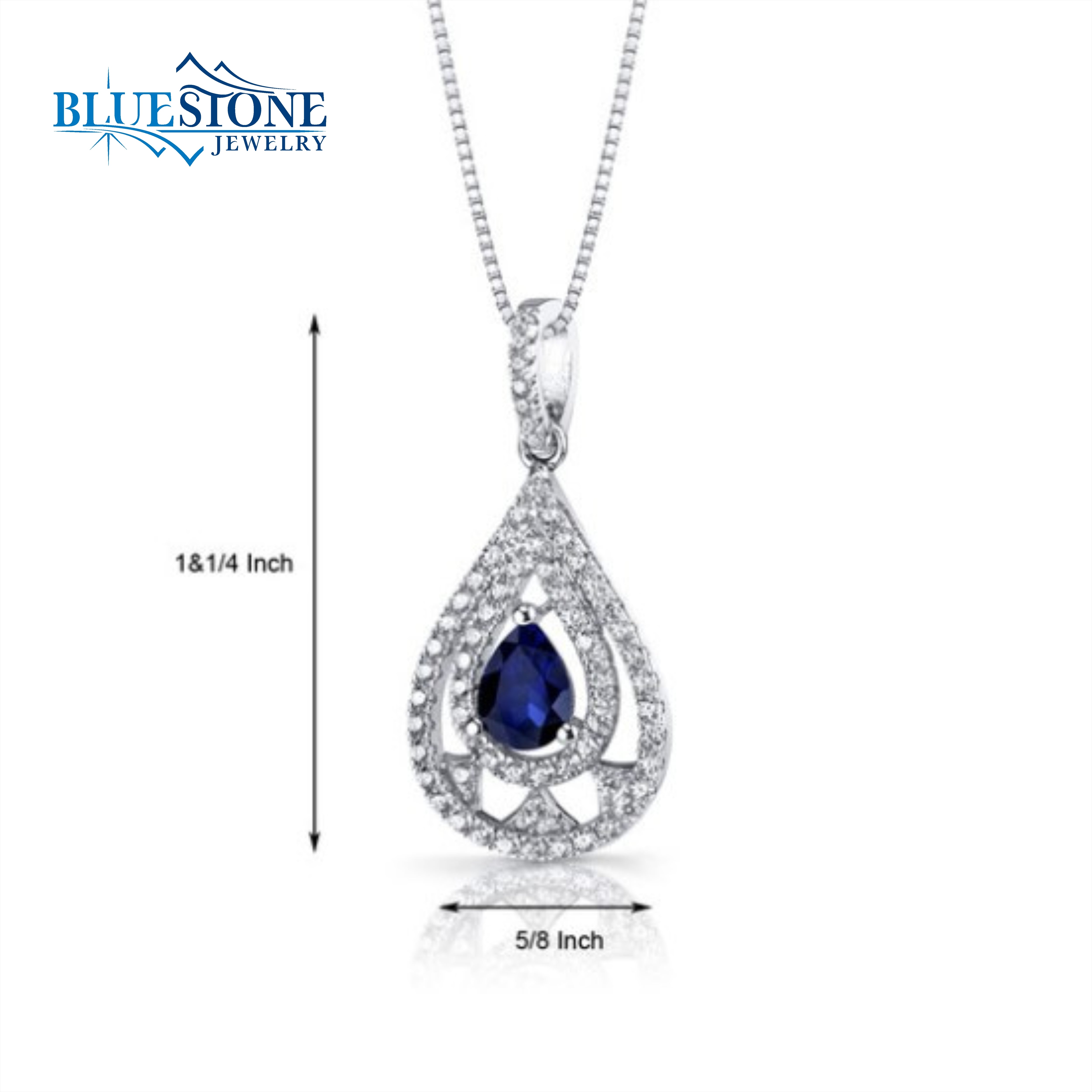 Sterling Silver Rhodium Plated Pendant with One 1.00 Carat Pear Cut Lab Created Sapphires and Cubic Zirconias. Pendant Measures 1.25" x 5/8" Wide. Comes on an 20 Inch Sterling Silver Box Chain.