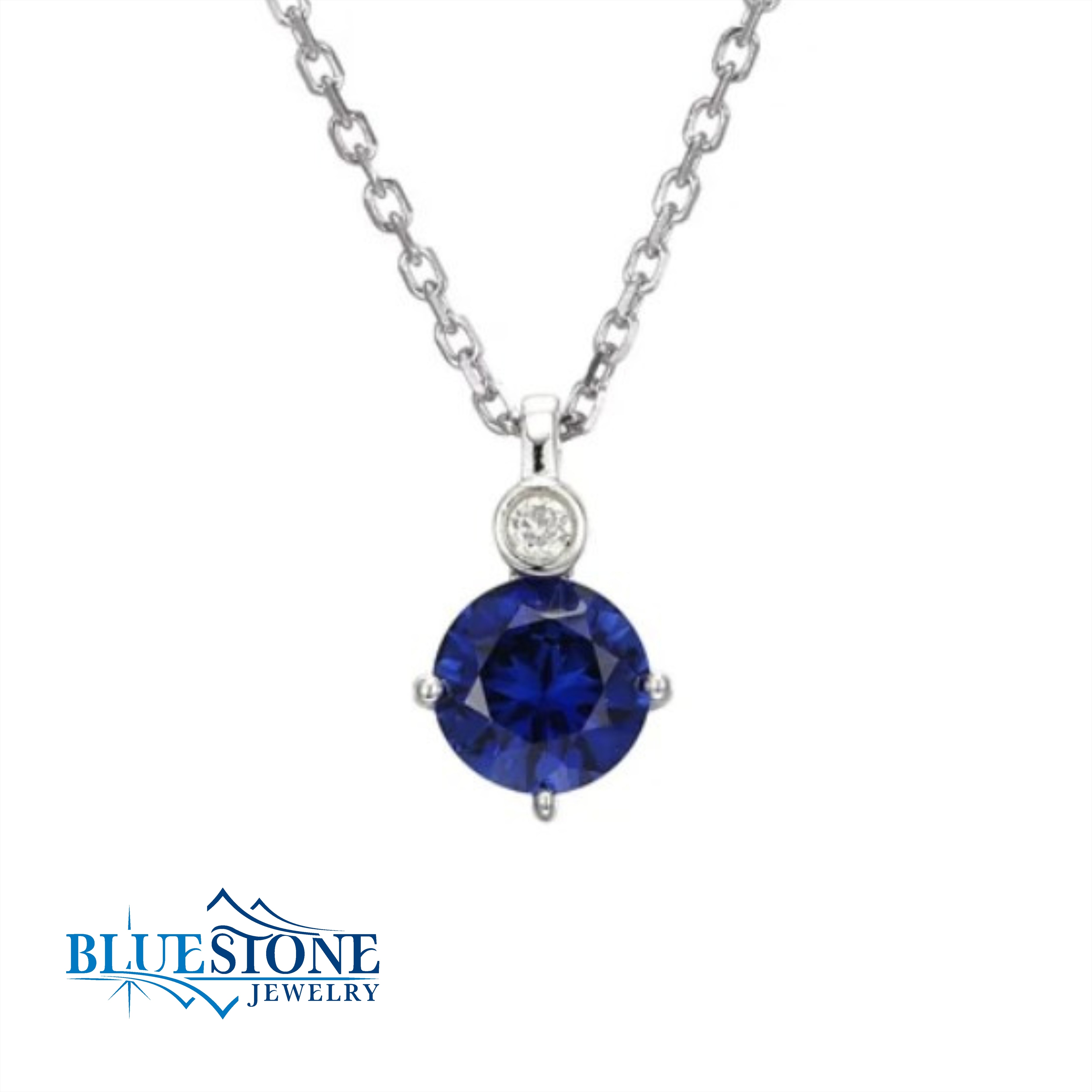 Sterling Silver Rhodium Plated Sapphire Birthstone Pendant with One 6mm Round Created Sapphire and One Round Lab Grown Diamond at 0.02 Total Carat Weight. Features One Hidden Round Created Ruby which represents inner beauty, inner peace & inner strength. Comes on a 19 Inch 1.9mm Faceted Crossed Diamond Cut Cable Chain. Can be worn at lengths between 17 to 19 inches.