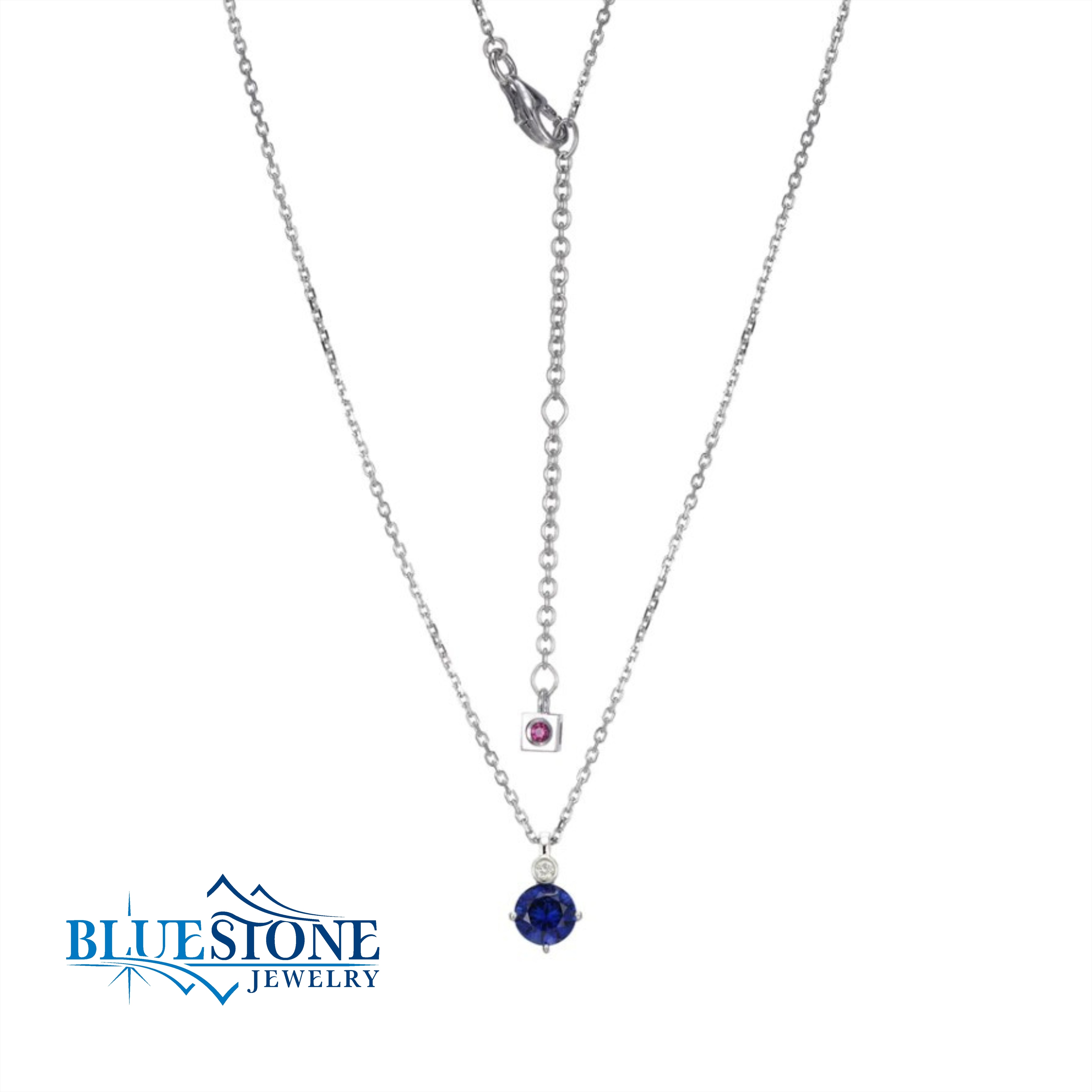 Sterling Silver Rhodium Plated Sapphire Birthstone Pendant with One 6mm Round Created Sapphire and One Round Lab Grown Diamond at 0.02 Total Carat Weight. Features One Hidden Round Created Ruby which represents inner beauty, inner peace & inner strength. Comes on a 19 Inch 1.9mm Faceted Crossed Diamond Cut Cable Chain. Can be worn at lengths between 17 to 19 inches.
