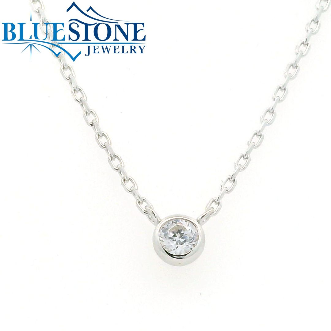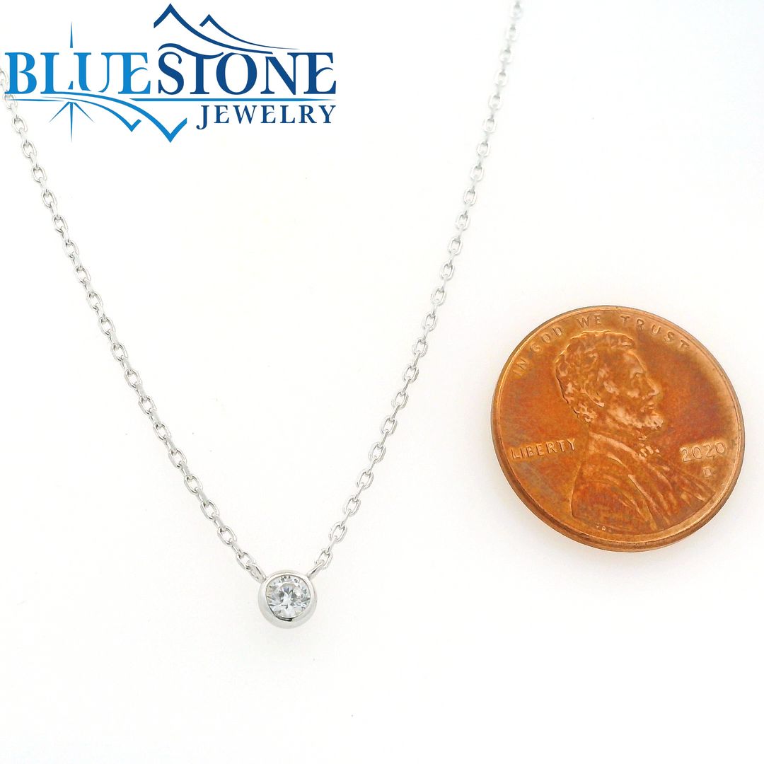 Sterling SIlver Rhodium Plated Round Solitaire Cubic Zirconia Necklace. Pendant Measures Approximately 4mm Wide. Necklace Measures 18 Inches Long. Can be worn at 17 and 16 inches.