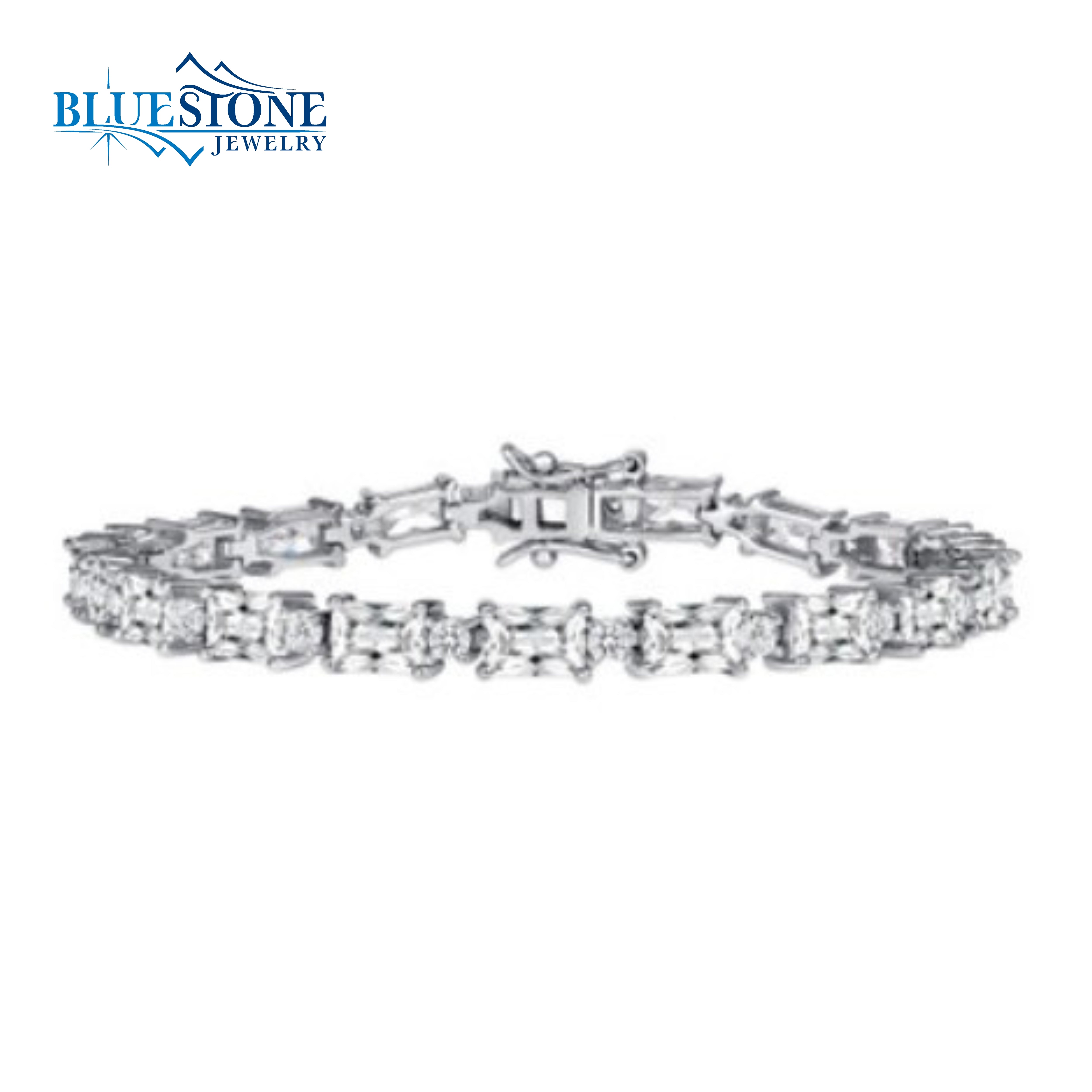 Sterling Silver Rhodium Plated Tennis Bracelet with 30 Variously Shaped Cubic Zirconias. Measures 7.5 Inches Long.