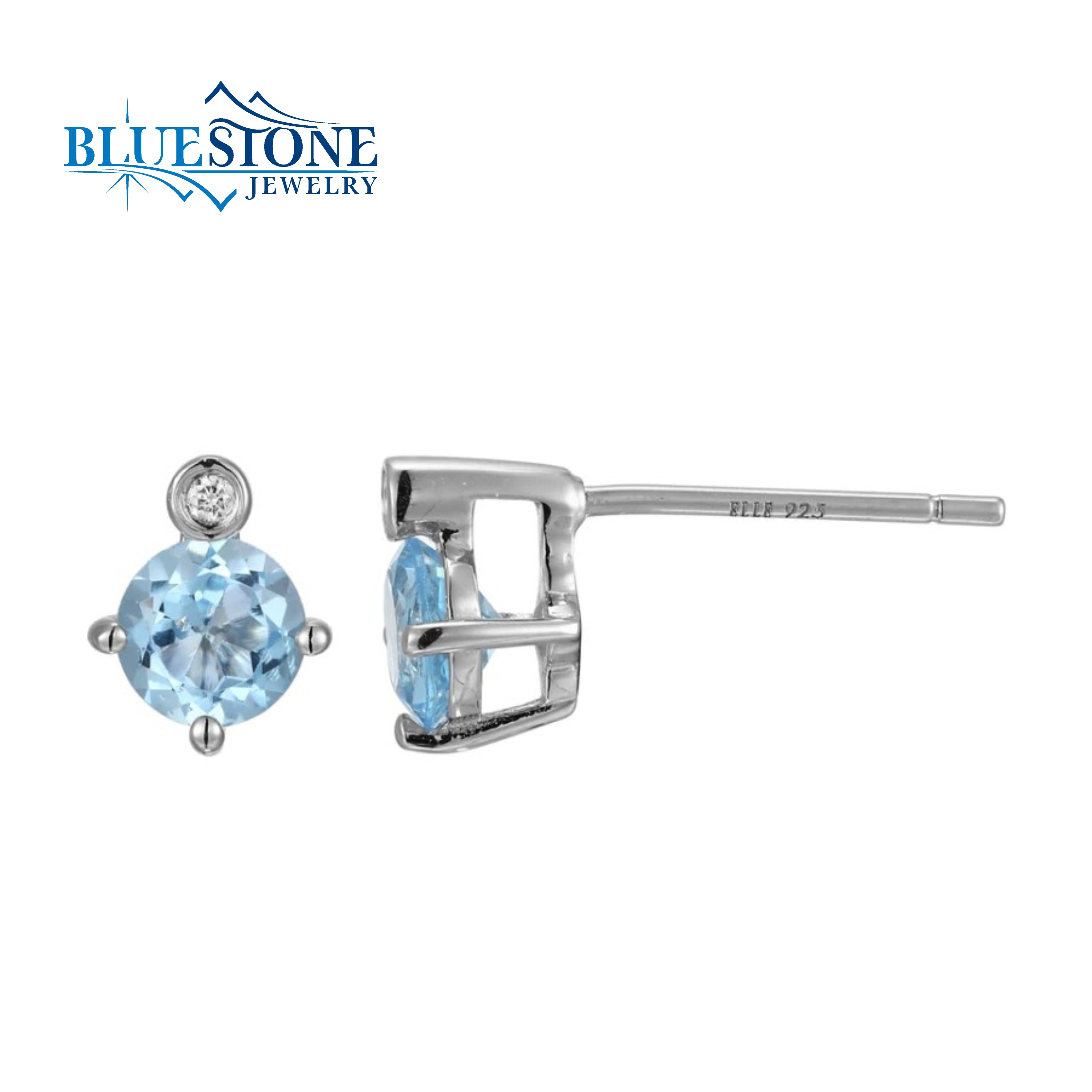 Sterling Silver and Rhodium Plated December Birthstone Stud Earrings with Two 5mm Round Swiss Blue Topazes and Two 0.8mm Round Lab Grown Diamonds at 0.02 Total Carat Weight F/C H-I/I1 Quality. Earrings Include Two Hidden Round Created Rubies Which Represents Inner Beauty, Inner Peace & Inner Strength.