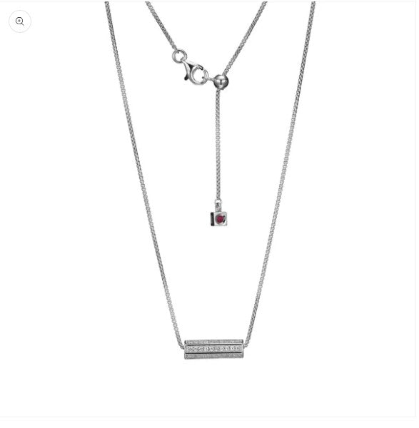 Sterling Silver Rhodium Plated Necklace With Created White Sapphires. Also Includes One Hidden Round Created Ruby Gemstone Which Represents Inner Beauty, Inner Peace & Inner Strength.Length is 19" With An Adjustable Barrel To Adjust Length Shorter.