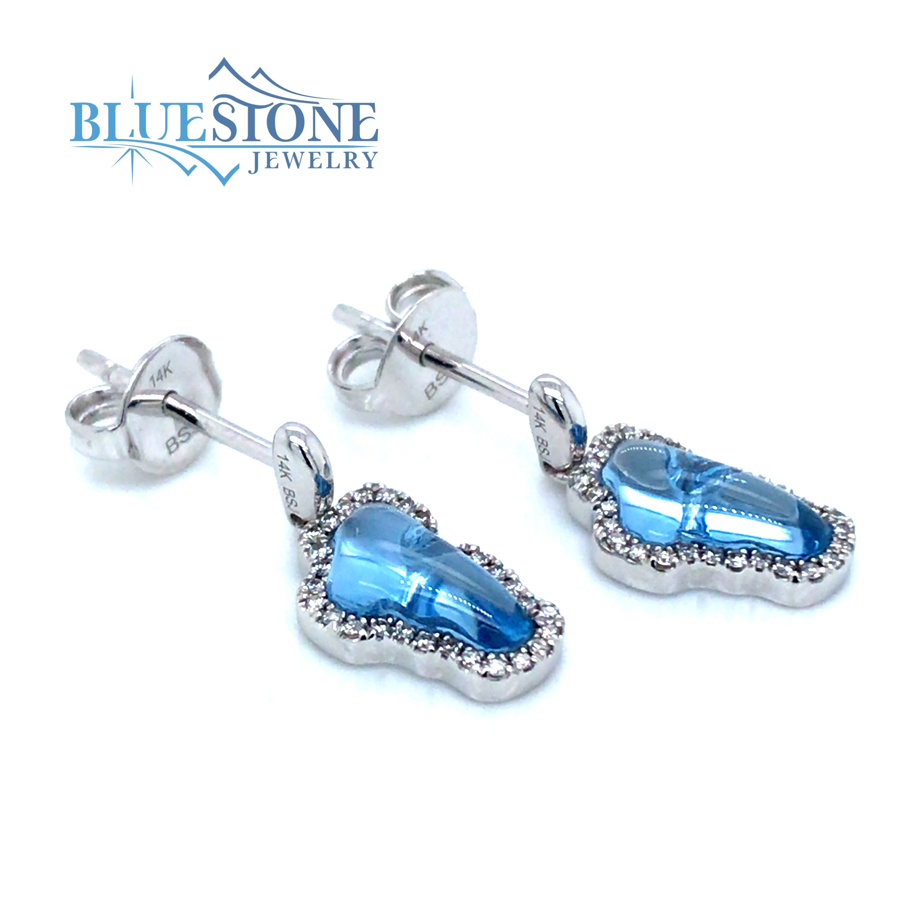 Small 14 Karat White Gold Lake Tahoe Outline Earrings with Two Lab Created Hydro Blue Topaz at 1.70 Carats Total Weight and 60 Round Diamonds at 0.17 Carats Total Weight of G Si1 Quality Diamonds. Measure Approximately 1/4" x 5/8".