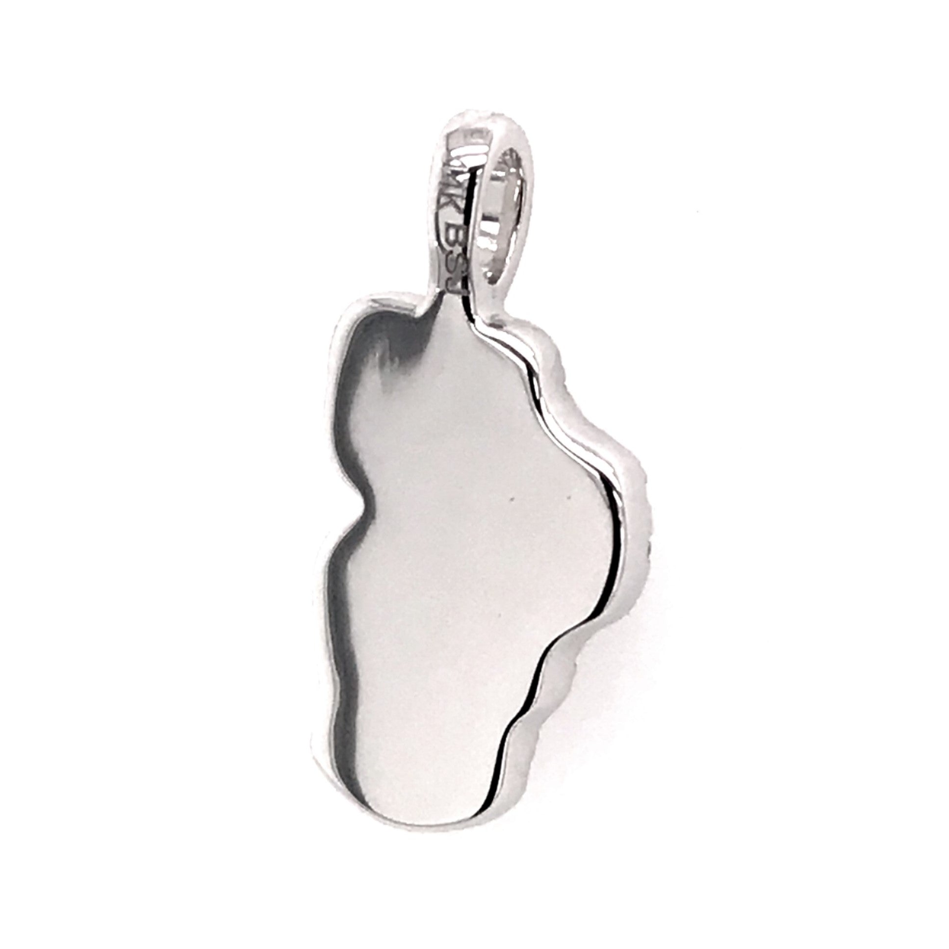 Small 14 Karat White Gold Lake Tahoe Pendant with a 0.95 Carat Hydro Blue Topaz, 30 Round Diamonds at 0.08 Carats Total Weight of G Si1 Quality Diamonds and a Solid Gold Back. Pendant Measures Approximately 16mm x 7mm. Backed with 14 Karat White Gold to Enhance the Brilliant Color of the Hydro Blue Topaz. Exclusive Bluestone Jewelry Design.Chain is sold separately. Comes on an 18 inch metal alloy DISPLAY chain.