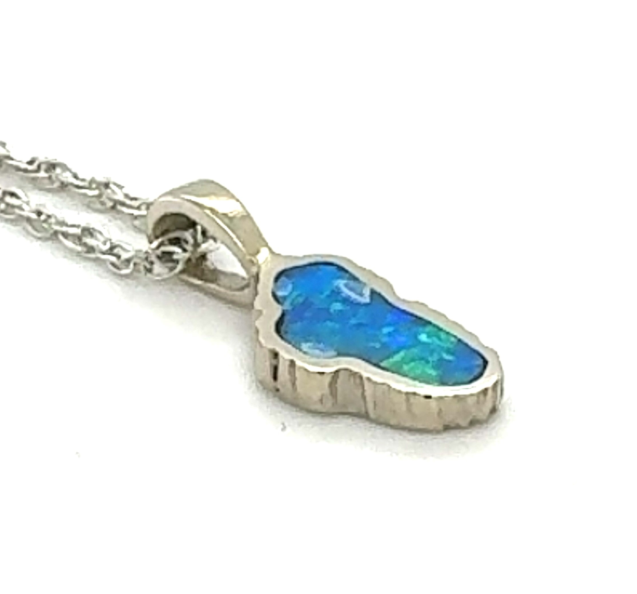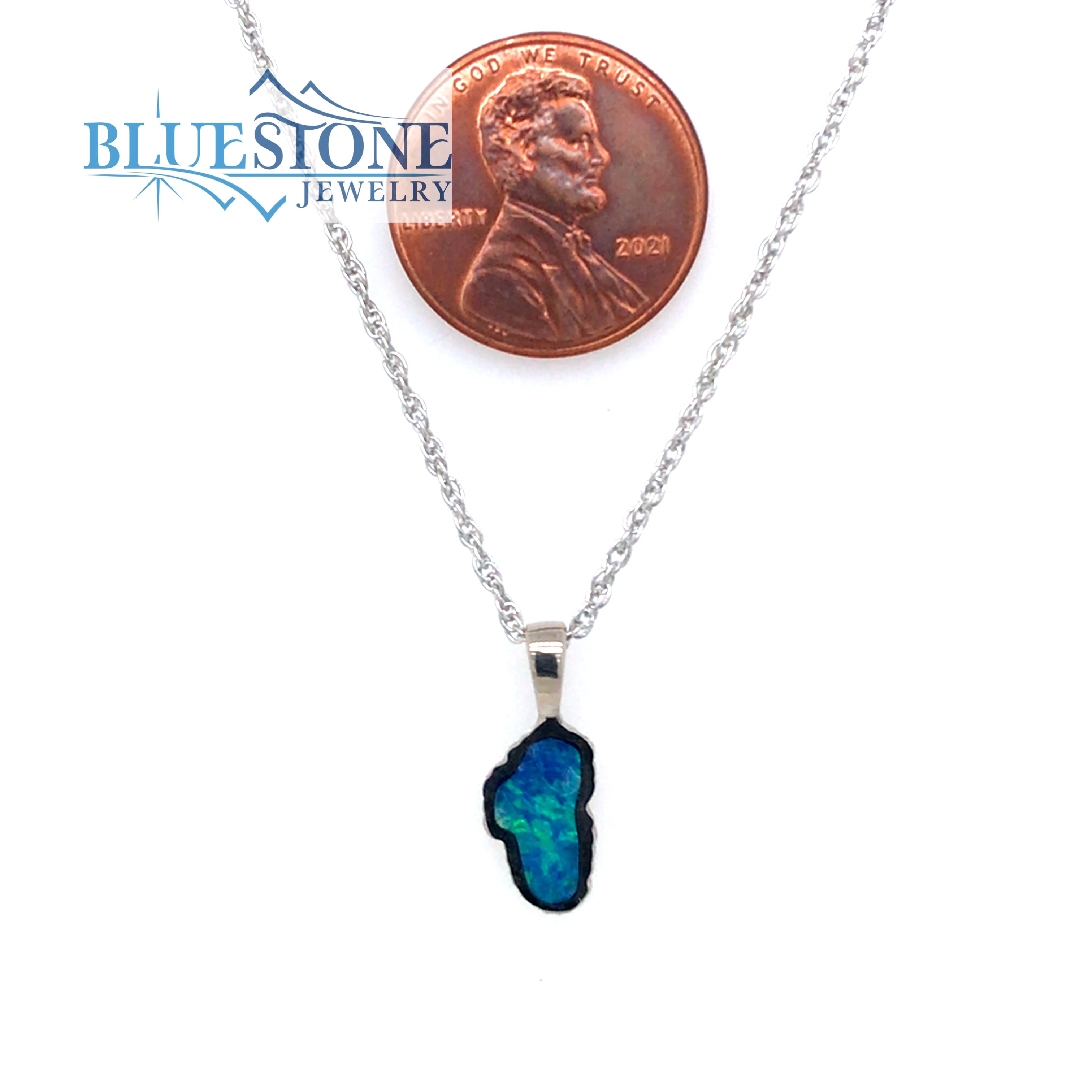 Small 14 Karat White Gold Lake Tahoe Pendant with Australian Opal.Measures approximately 1/2 of an inch tall and 1/4 of an inch wide. Comes on 18 inch alloy display chain. (It is recommended to switch to a different chain.)