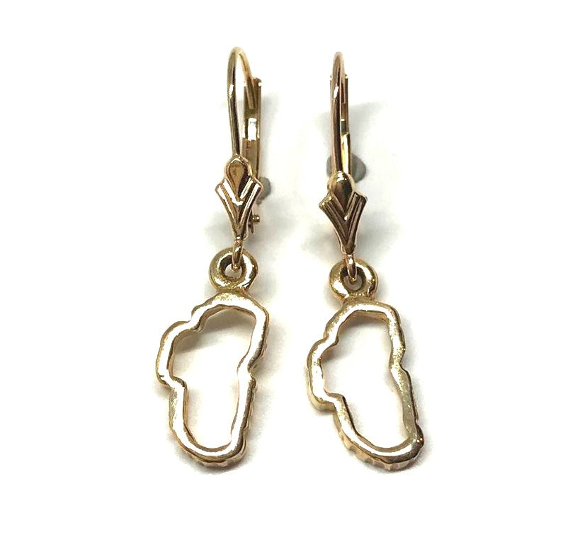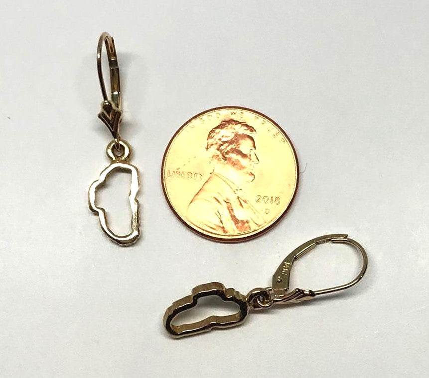 Small 14 Karat Yellow Gold Outline of Lake Tahoe Lever Back Earrings.Measures 1 inch top to bottom.