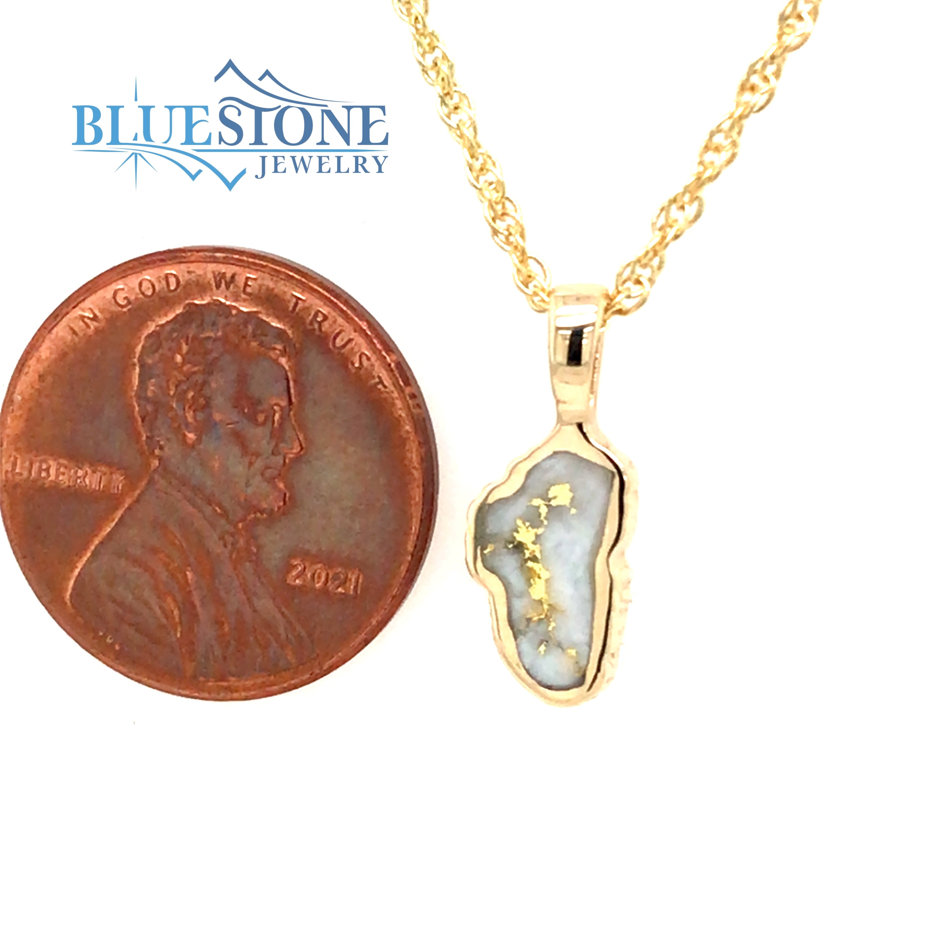 Small 14 Karat Yellow Gold Pendant with a Lake Tahoe Shaped Gold Quartz Gemstone from the Sixteen to One Mine in California.Chain is sold separately. Comes on an 18" metal allow DISPLAY chain.*Natural Gold Quartz gemstone appearance may vary from stone to stone*