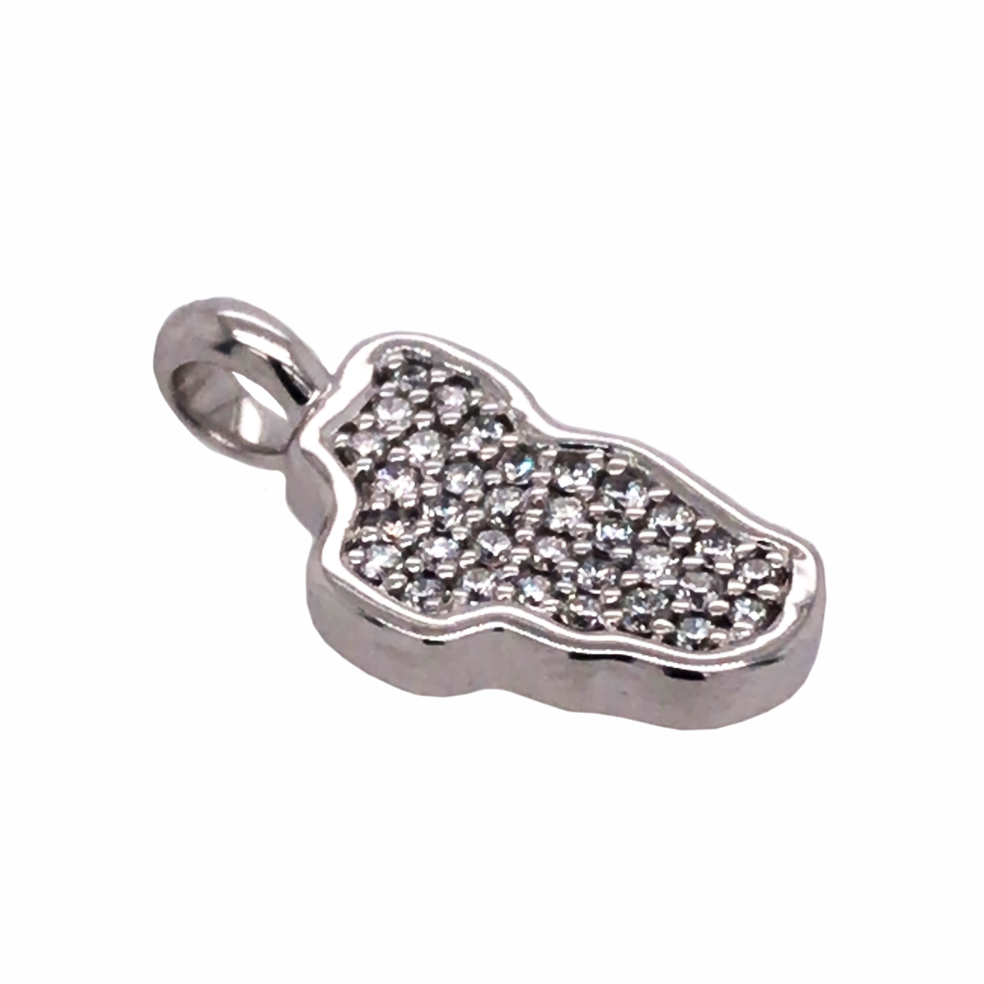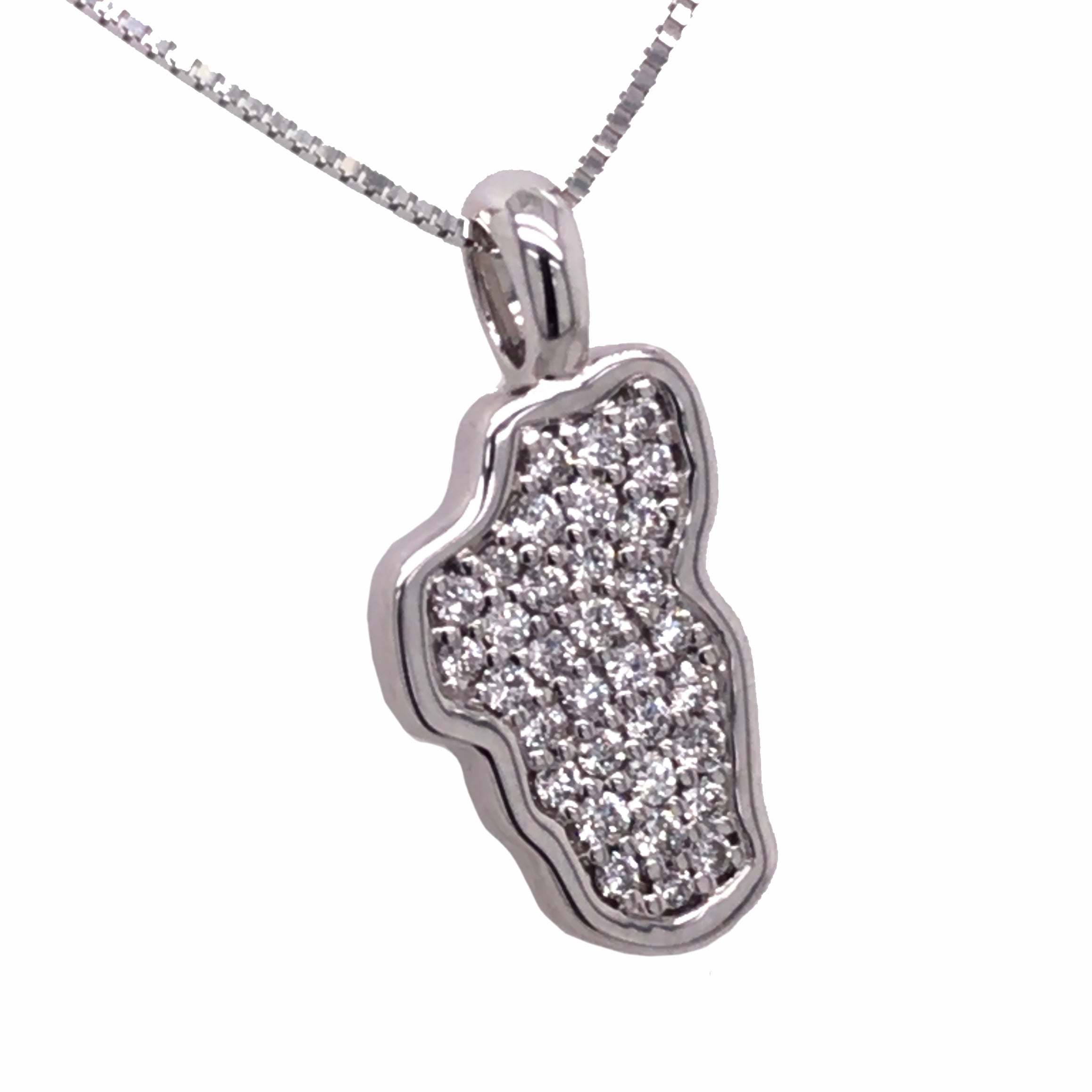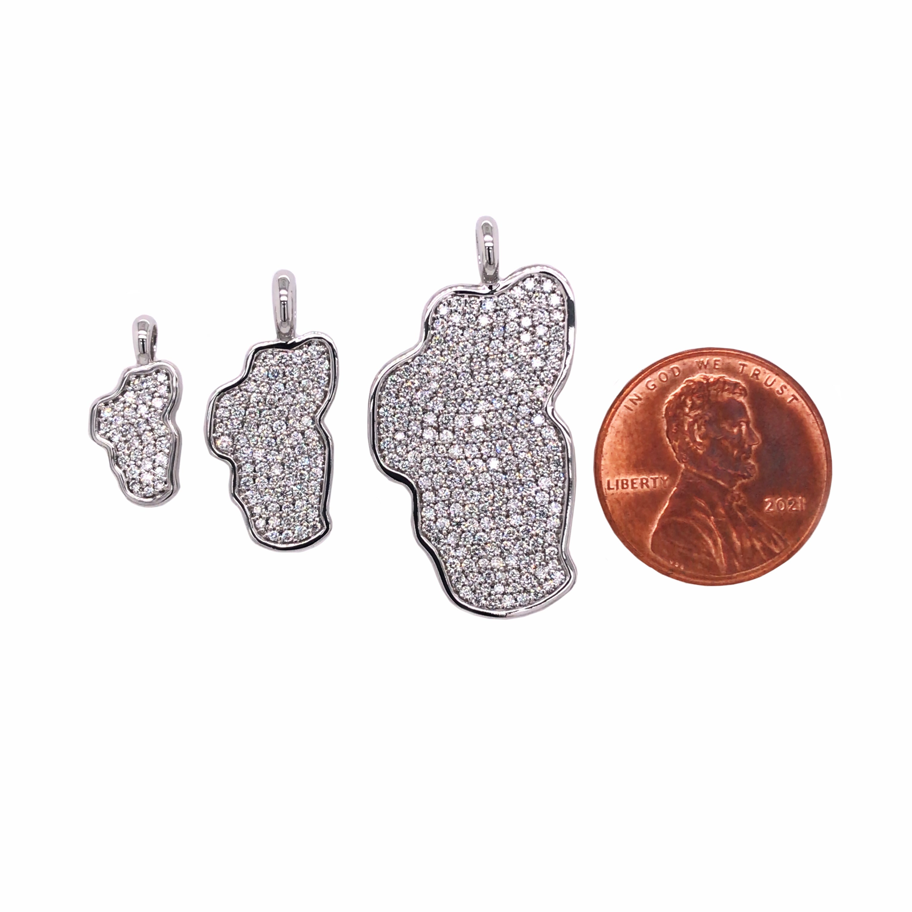 Small 14 Karat White Gold Lake Tahoe Pendant with 33 Round Diamonds at 0.13 Carats Total Weight at G SI1 Quality.Measures Approximately 7mm x 15mm. Chain sold separately. Comes on an 18" metal alloy DISPLAY chain.