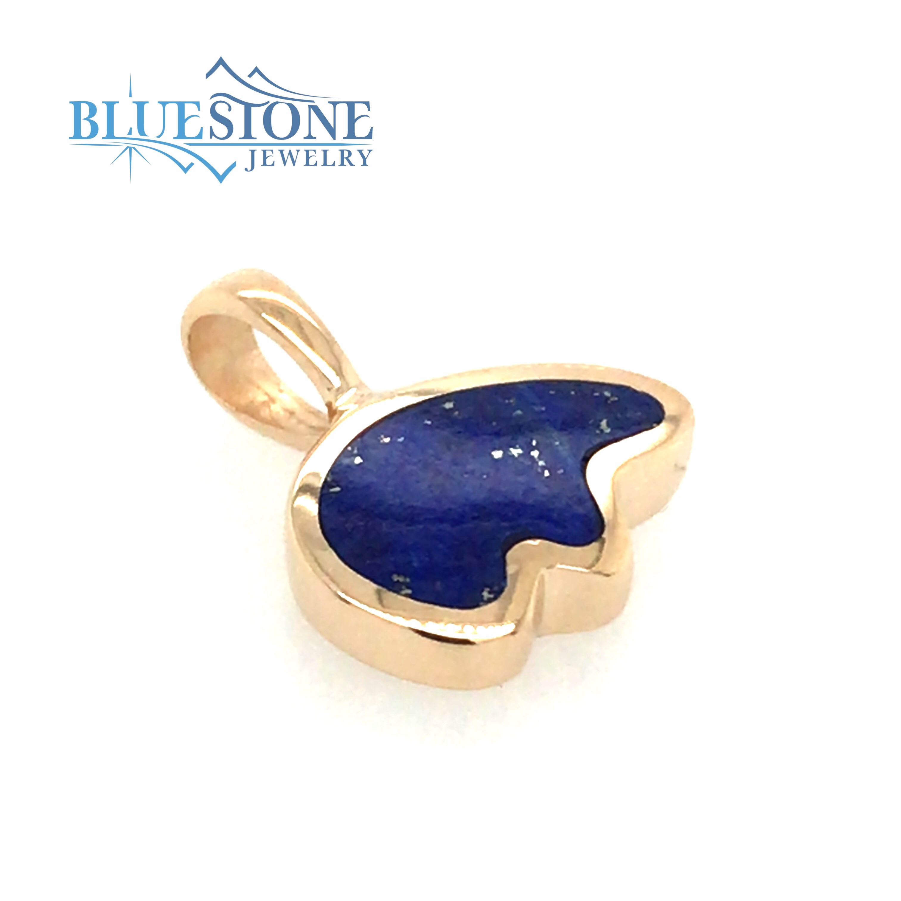 Small 14 Karat Yellow Gold California Bear Pendant with Inlaid Lapis Lazuli. Bear measures approximately 7mm wide. Chain is sold separately. Comes on base metal DISPLAY chain. It is highly recommended to switch to a different chain for wearing.