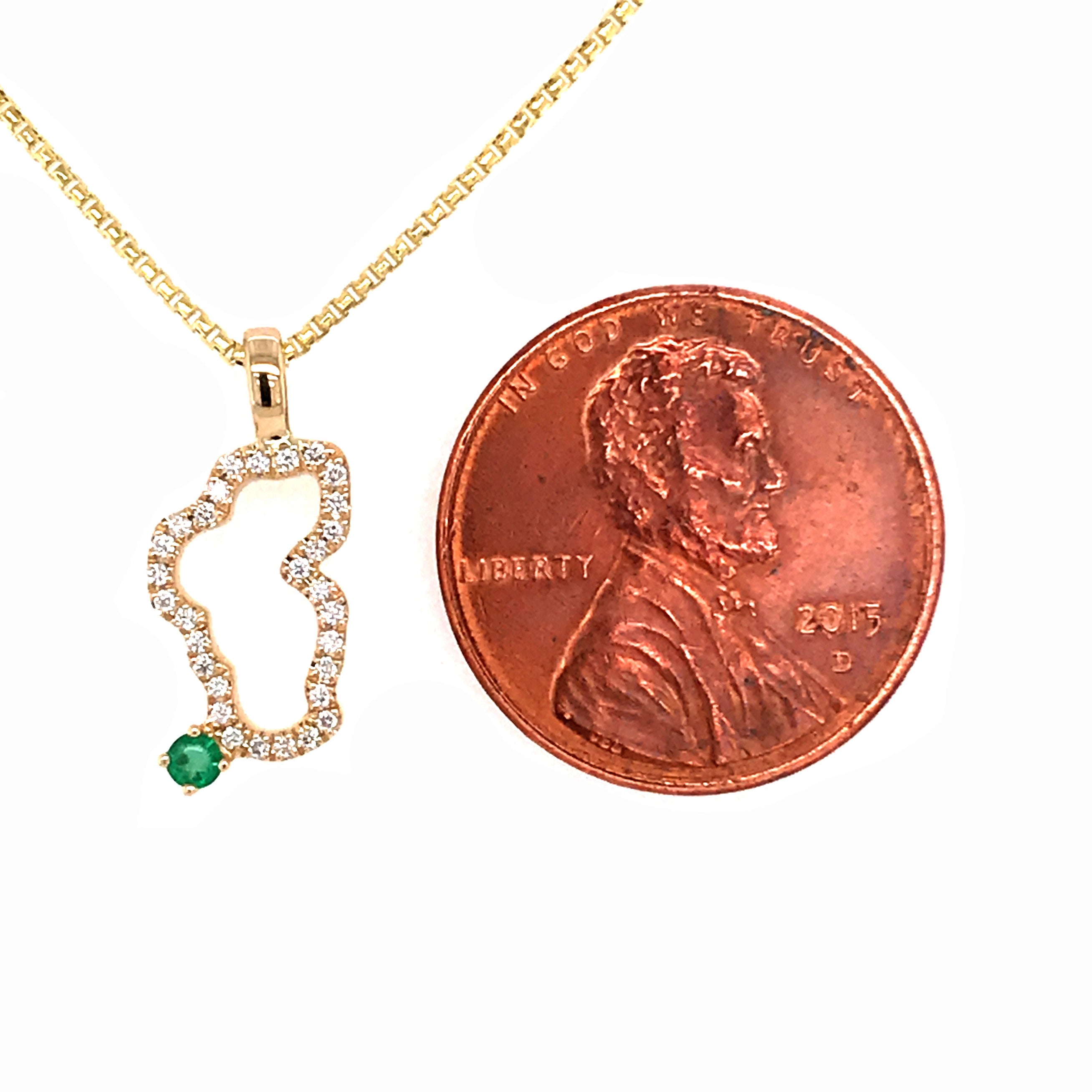 Small 14 Karat Yellow Gold Pendant with 29 Round Diamonds Surrounding Lake Tahoe at 0.07 Carats Total Weight of G Si1 Quality Diamonds and One 2mm Round Natural Emerald at the Location of Emerald Bay, CA. Measures approximately 8mm by 17mm. Bluestone Jewelry Exclusive Design.