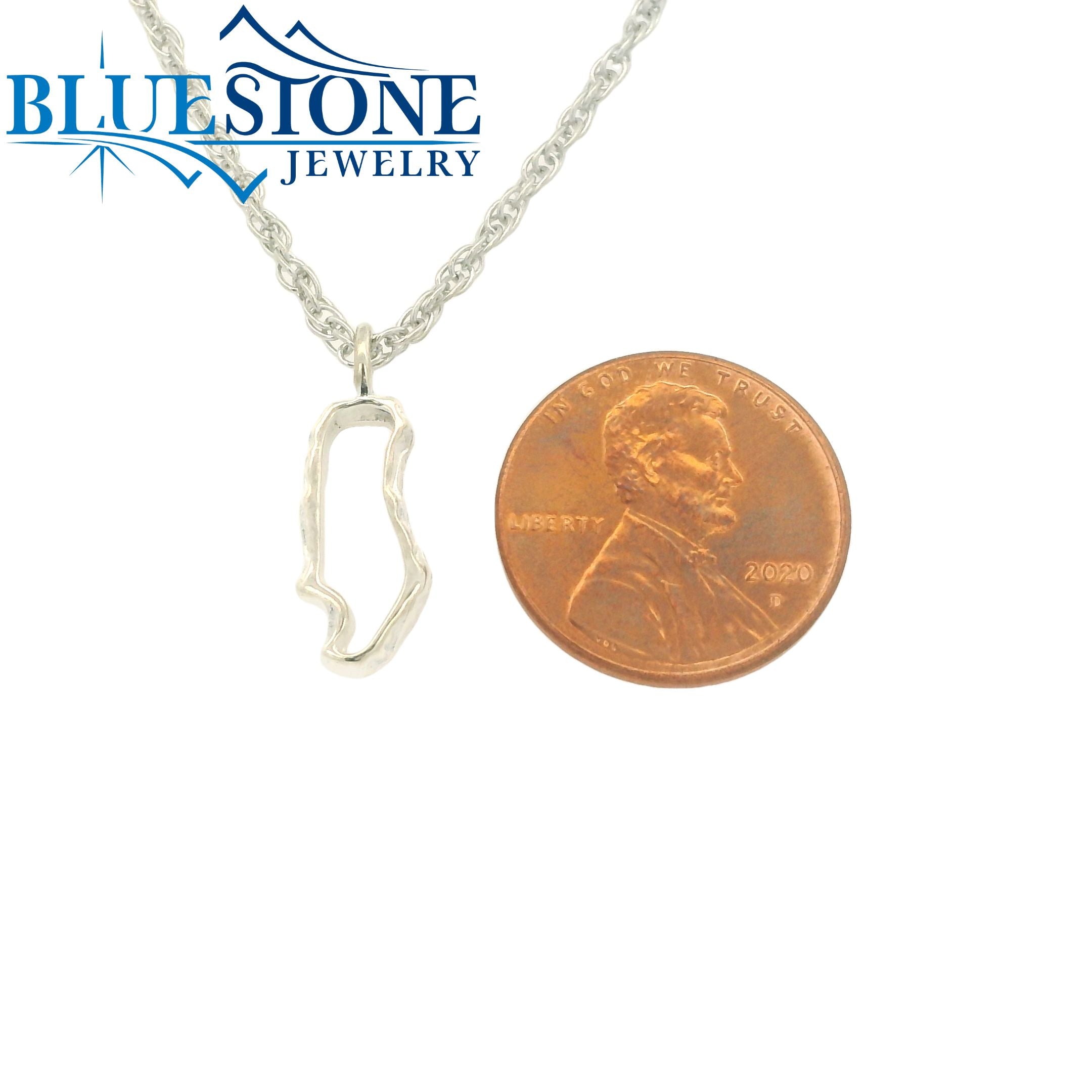 Small Sterling Silver Outline of Donner Lake Pendant. Chain is sold Separately. Comes on a metal alloy DISPLAY chain.
