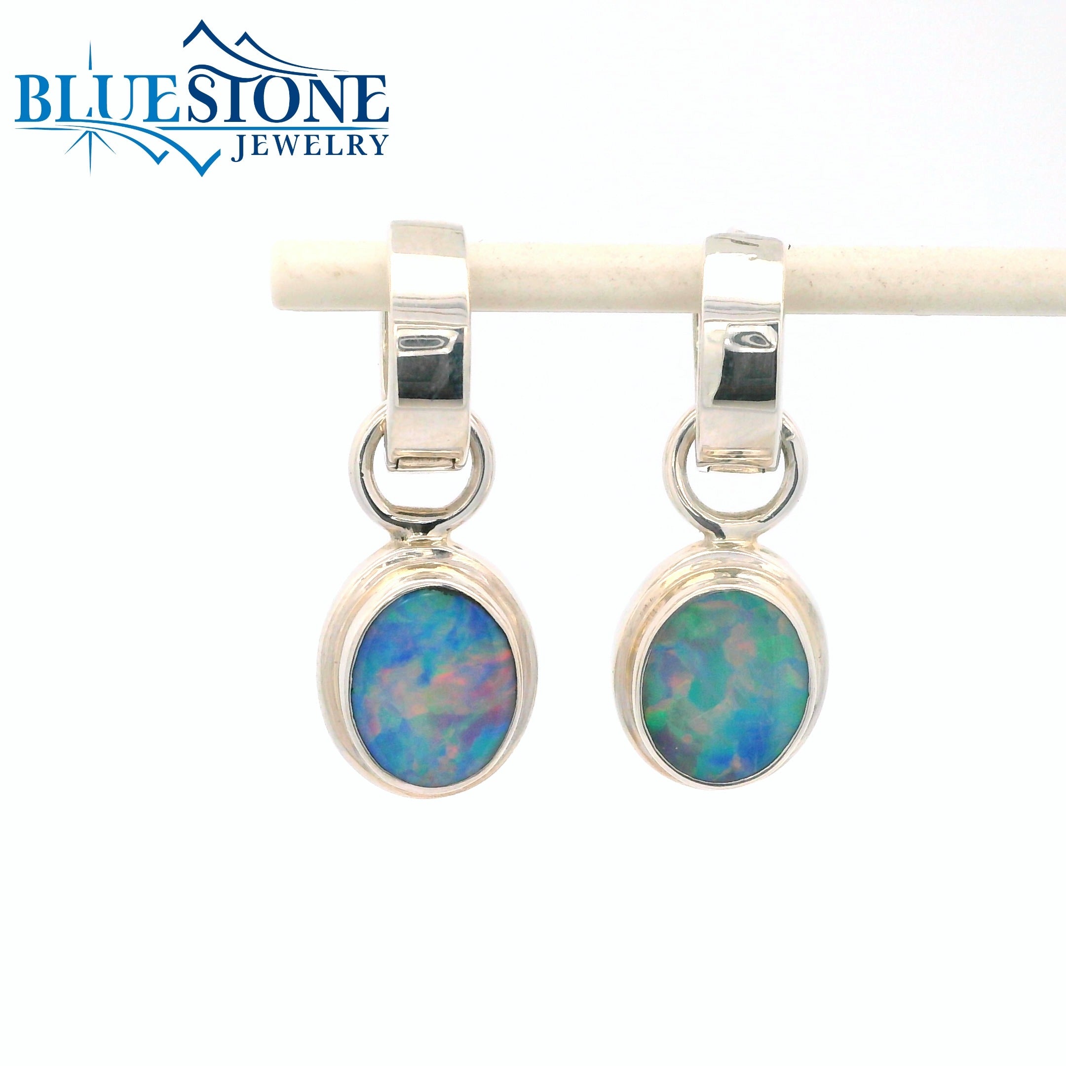 Small Sterling Silver Wire Earrings With Two 8mm x 10mm Oval Natural Australian Opals. Earrings Measure Approximately 1 Inch Long. Opals Can Be Removed So That The Huggy Hoops Can Be Worn Separately. Local Lake Tahoe Designer. Natural Opals Will Vary On Color, Shape and Size.