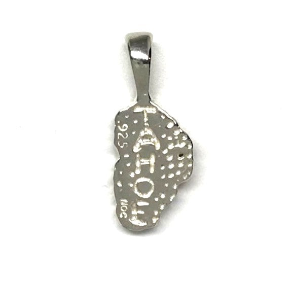 Small Sterling Silver Lake Tahoe Pendant with Turquoise. Measures approximately 1/2 of an inch tall and 1/4 of an inch wide. Comes on 18 inch alloy DISPLAY chain. (It is HIGHLY recommended to SWITCH onto another chain for wear.)