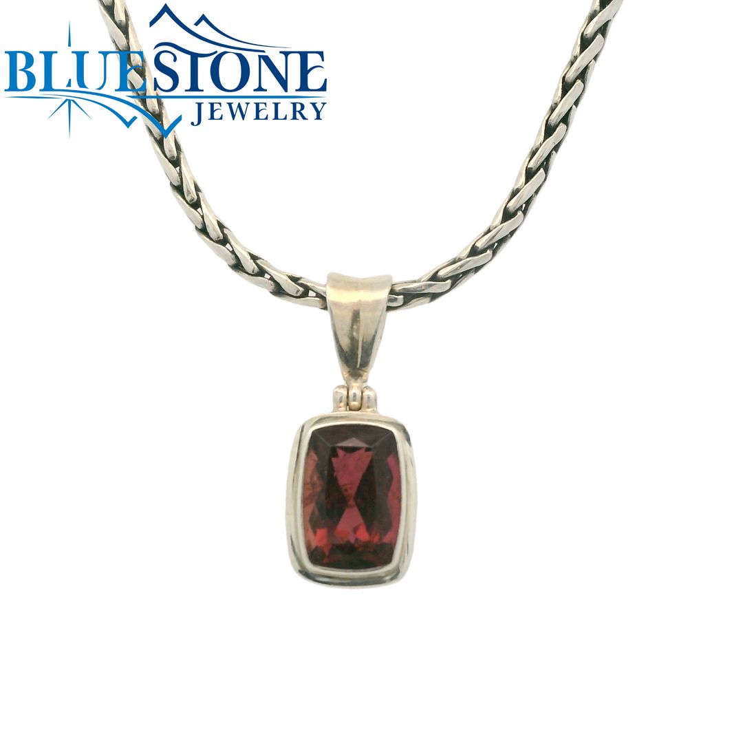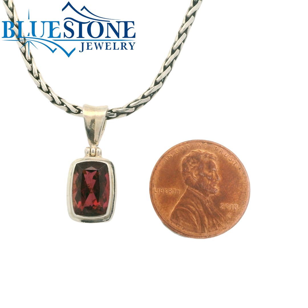 Small Sterling Silver Pendant with Rectangular Cut Pink Tourmaline, Pendant Measures 21.8mm by 9.4mm.Pendant Comes on Hand Woven Petite Weight Sterling Silver 16 Inch Chain.Local Lake Tahoe Artist.