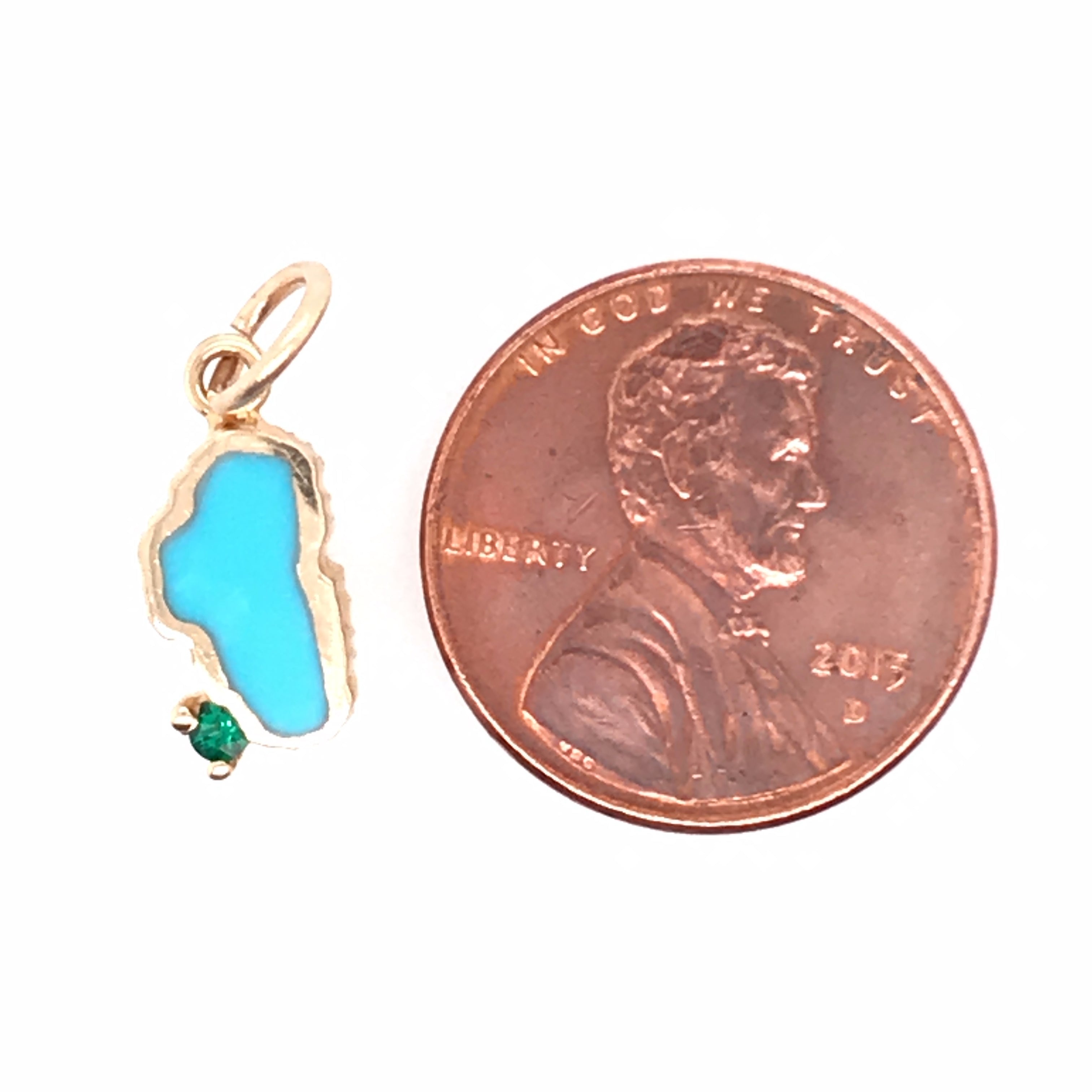 Small 14 Karat Yellow Gold Charm with a Lake Tahoe Turquoise & a Round Chatham Emerald at the Location of Emerald Bay, CA.Measures 1/2 of an inch tall. PLEASE NOTE: This charm comes on an openable jump ring meant to be placed onto a charm bracelet. After purchasing this charm we highly recommend soldering the openable jump ring to keep the charm secure, and prevent loss. If you plan on wearing your Lake Tahoe as a necklace we suggest selecting a PENDANT instead of a charm. Natural Stone's Appearance May Vary from Photo.