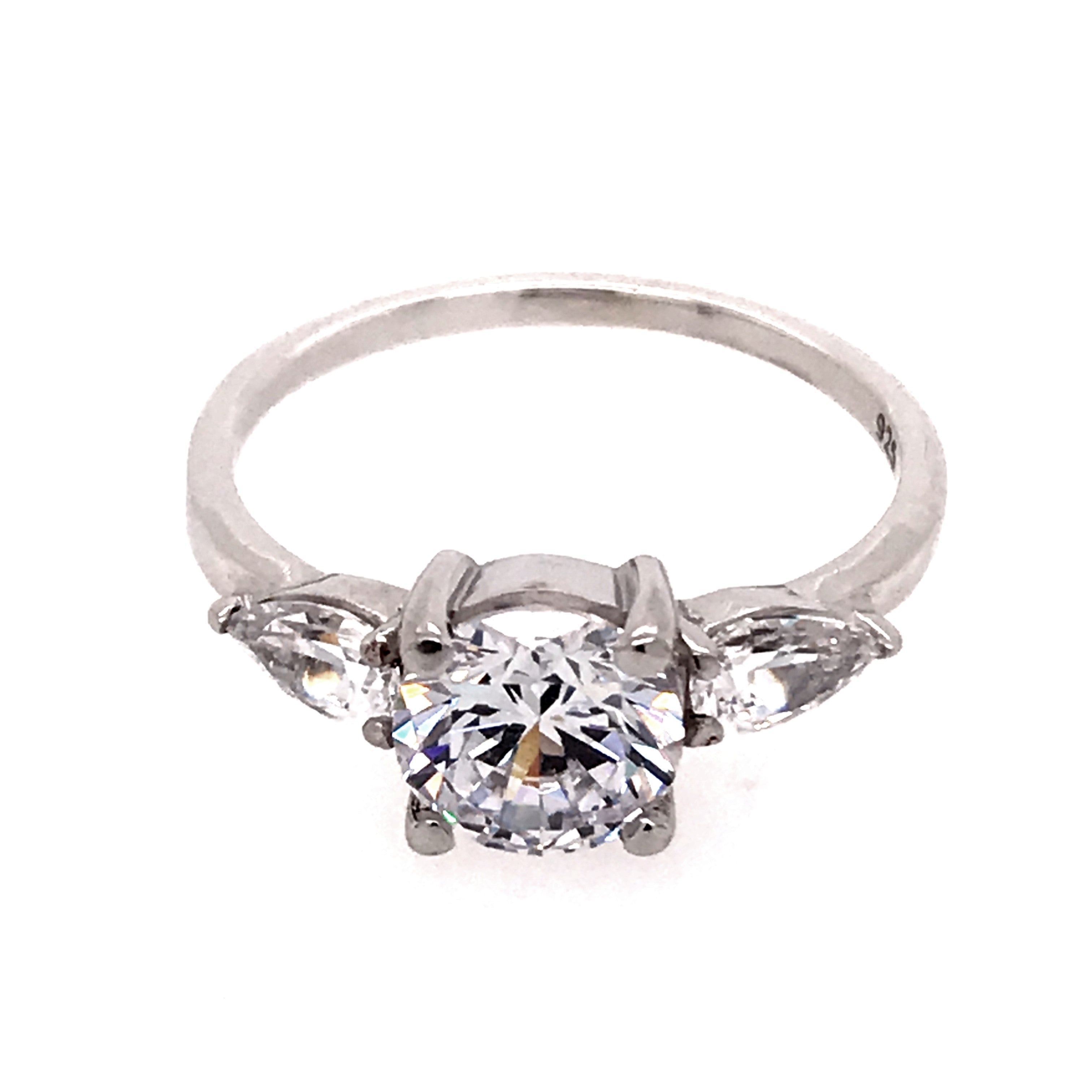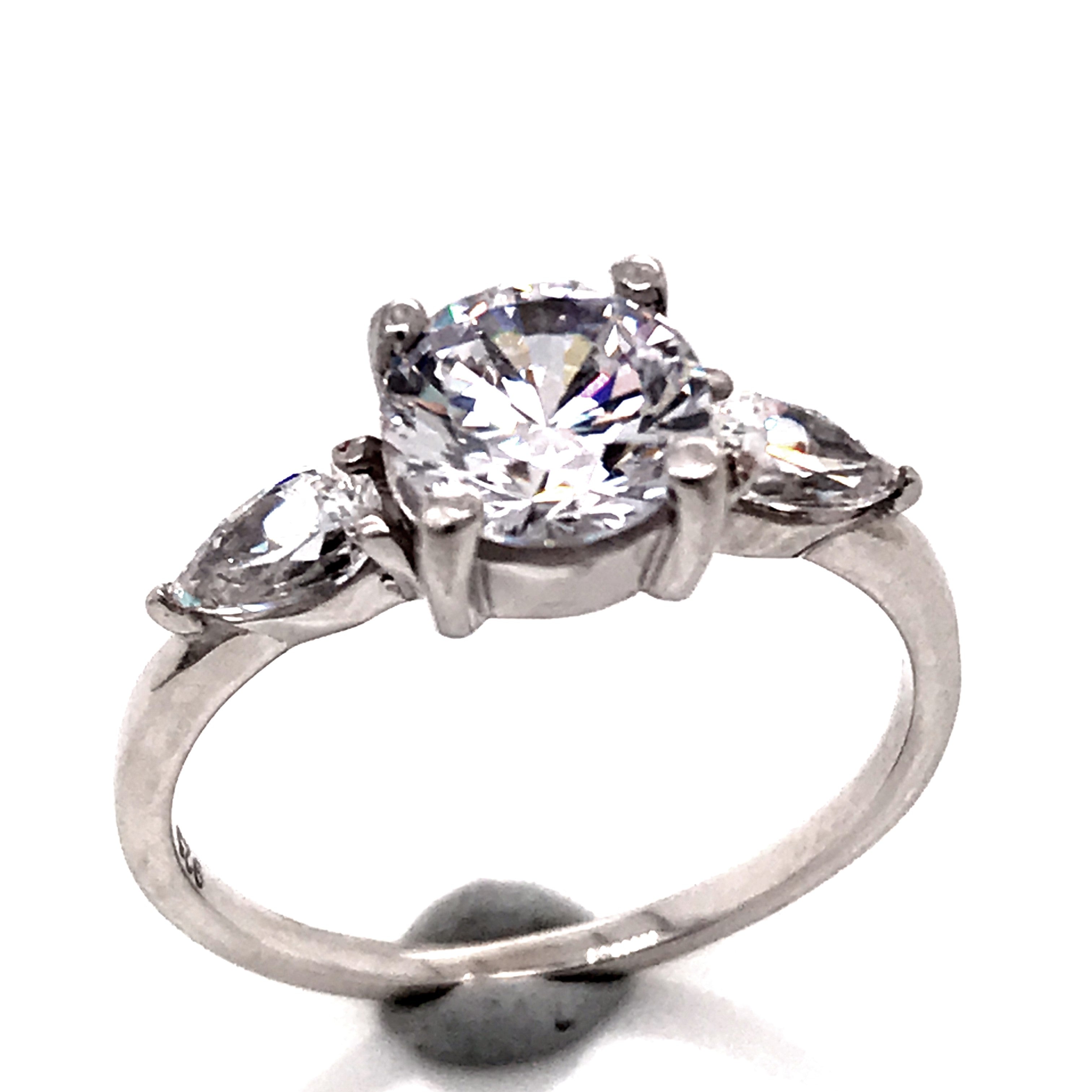 SILVER EXAMPLE of a 14 Karat White Gold Engagement Ring with a 6.5mm 1.06 Carat Round Lab Grown Diamond and Two 5x3mm Pear Cut Lab Grown Diamonds at 0.40 Carats Total Weight. Ring Size 5. Lab Grown Diamond quality would be G color and SI1 or better on special ordered ring.EXAMPLE RING Can be special ordered or sold as is for $165.