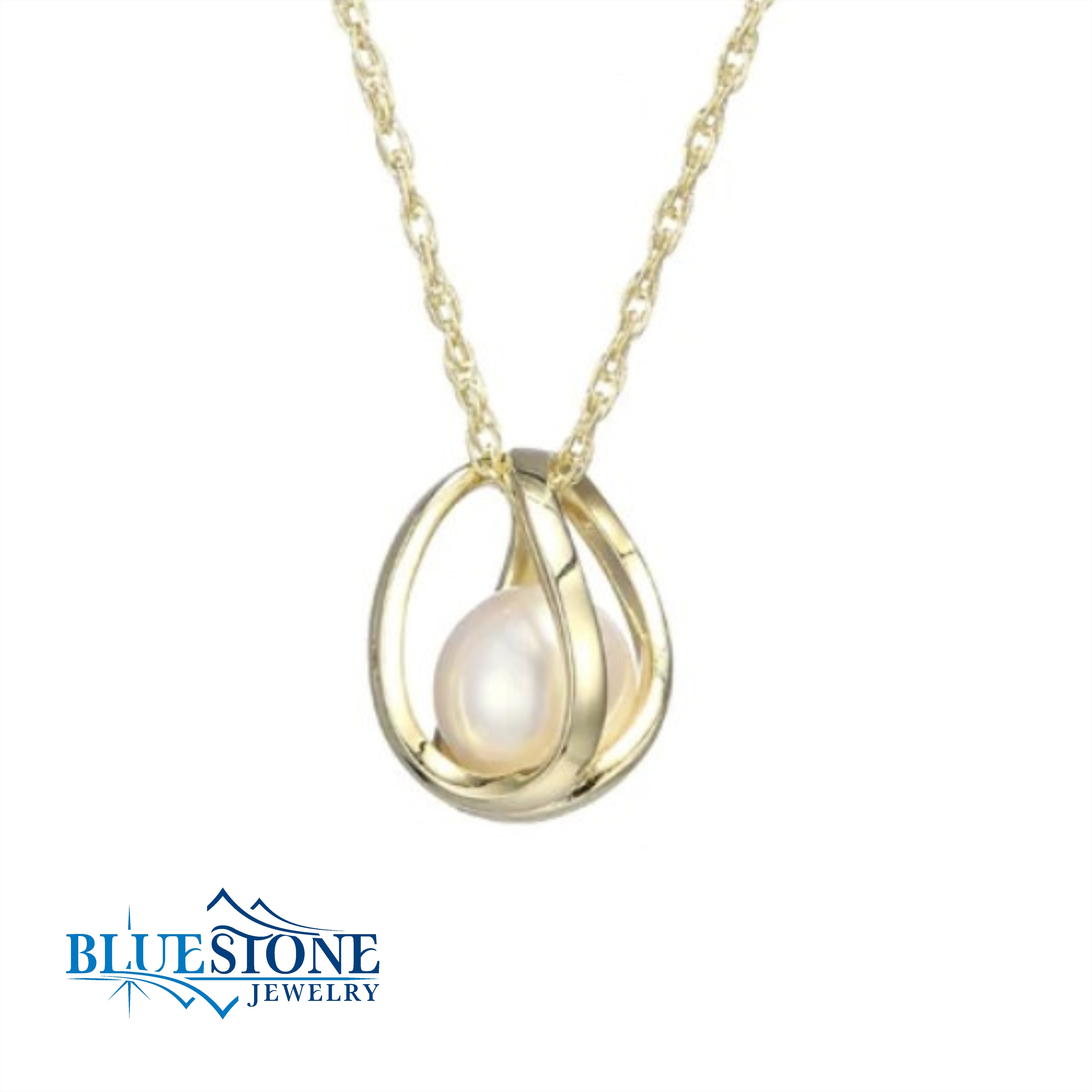 Sterling Silver 14 Karat Yellow Gold Plated Pendant with One 8mm Round Pearl. Features One Hidden Round Created Ruby which represents inner beauty, inner peace & innerstrength. Comes on a 20 Inch Rope Chain. Can be worn at lengths between 17 to 20 inches.