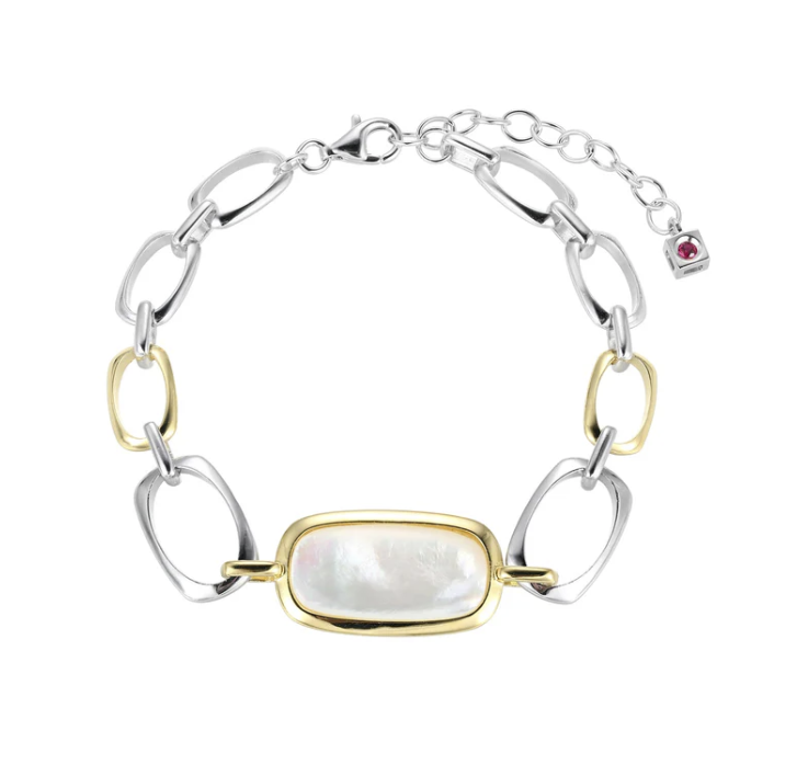 Sterling Silver and 14 Karat Yellow Gold Plated Bracelet Featuring One Mother of Pearl Gemstone.Bracelet Includes One Hidden Round Created Ruby Which Represents Inner Beauty, Inner Peace & Inner Strength.Bracelet Measures 8 Inches Total Length, But Can Be Worn Between 6.5 Inches to 8 Inches.
