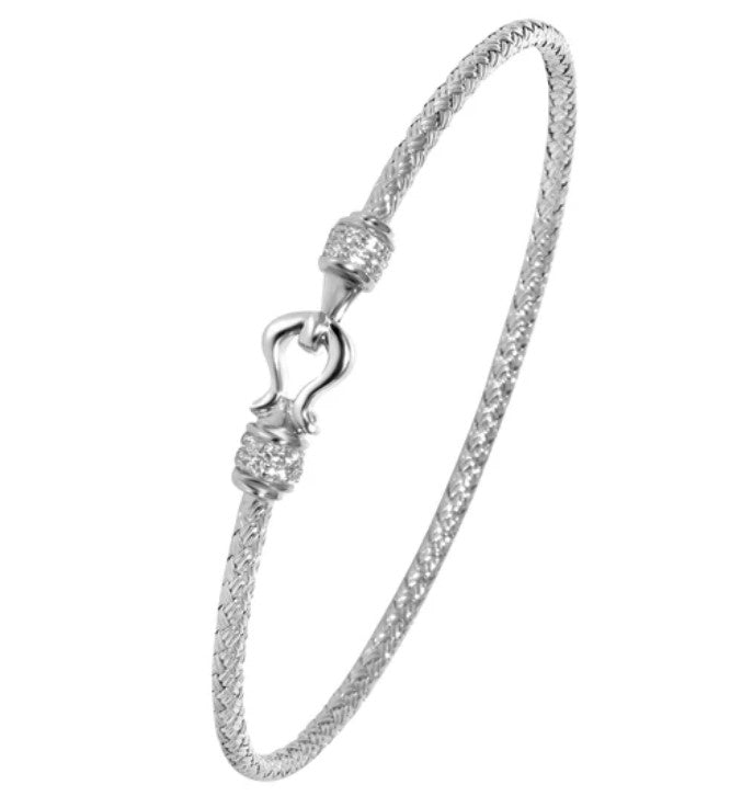 Sterling Silver Rhodium Plated 2mm Braided Rope Bracelet With Two Sterling Silver Detailed Clasps With Cubic Zirconia Gemstones. Bracelet Length is 6.75"