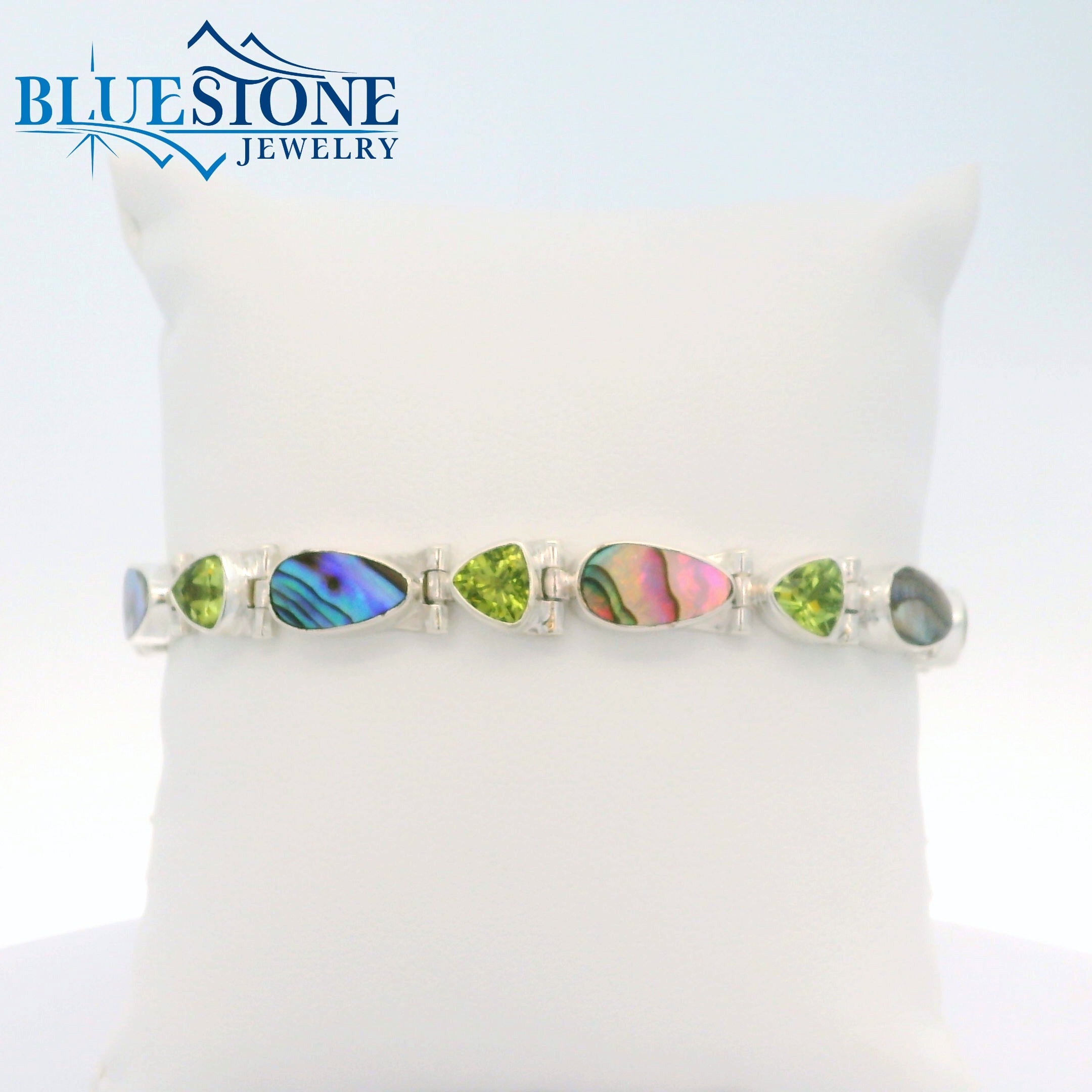 Sterling Silver Rhodium Plated Bracelet with 6 Rounded Pear Cut Abalone Shells and 6 Trillion Cut Peridot Gemstones. Bracelet Can be Worn Between 6.5 inches and 8 inches, and Measures 7.8mm Wide.