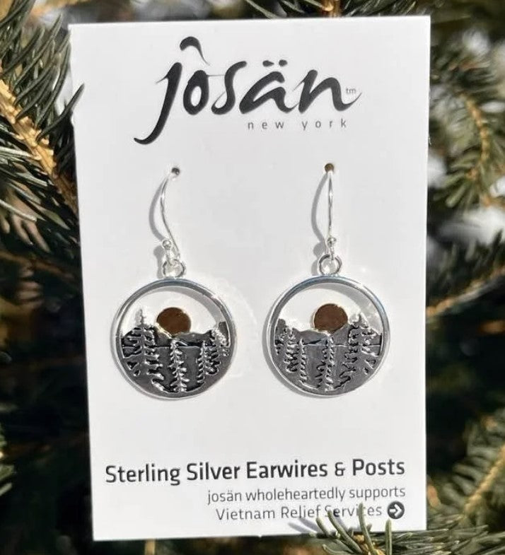 Sterling Silver Earrings with French Hooks Featuring Mountains, Pine Trees and hand painted Gold Moons. Measure 3/4 Inch Wide.All sales benefit the Vietnam Relief Services charity, improving the quality of schools in remote parts of Vietnam.
